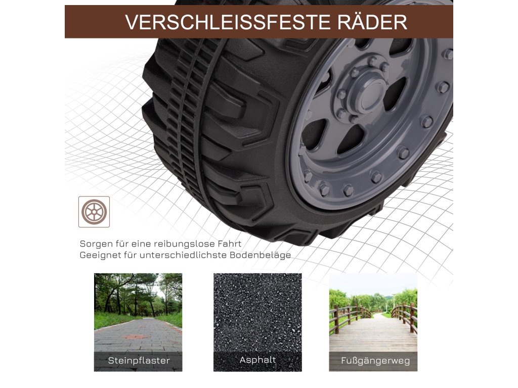 - ✔ Čtyři široké strukturované pneumatiky zajišťují stabilitu