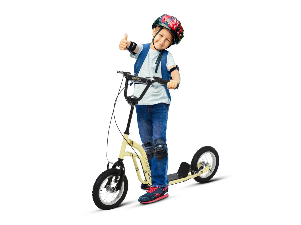 - S brzdami: Městská koloběžka je vybavena dvojitým brzdovým systémem pro snadné brzdění. Nízká plošina a velká kola zajišťují bezpečnou jízdu.