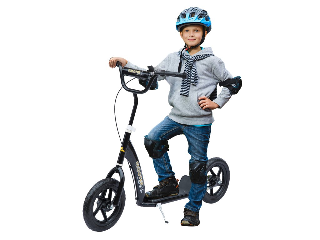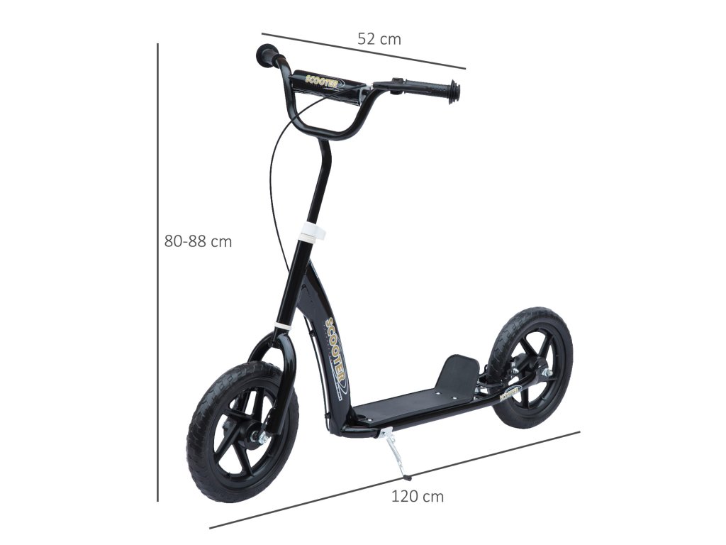 - Celkové údaje: Koloběžka je vhodná pro jízdu na kolečkových bruslích: Celkové rozměry: D120 x Š52 x V80-88 cm, Šířka řídítek: 50 cm, Výška protiskluzového pedálu: 11 cm, Rozměry: D32 x Š11 cm, Pneumatiky: 12 palců, Materiál: Rám: kov, Rám pneumatik: PVA, Pneumatiky: EVA, Barva: černá, Max. Nosnost: 50 kg, DOPORUČENÍ PRO VĚK: 5-12 let.