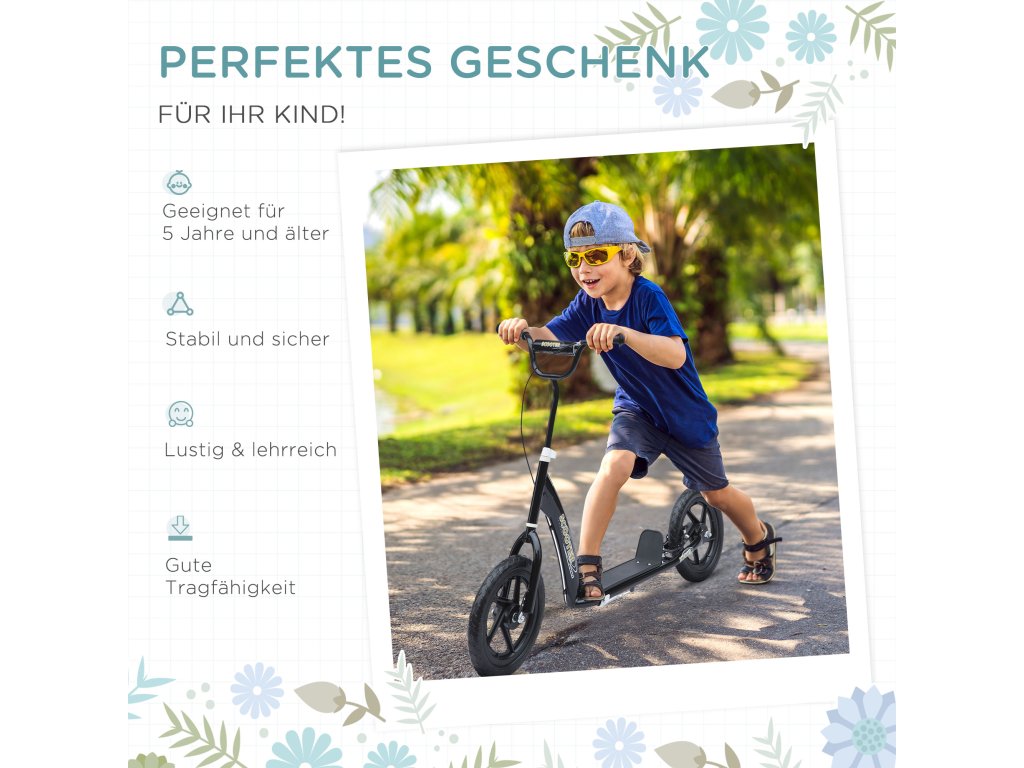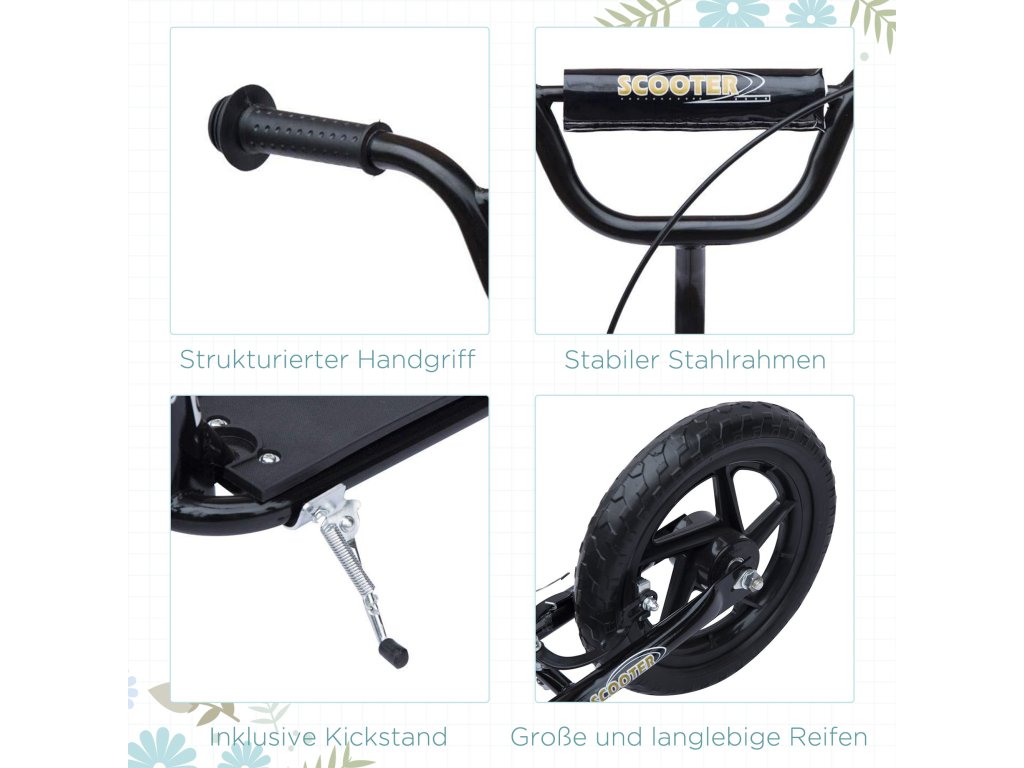 Koloběžka pro celou rodinu. Nejen pro děti, ale i pro sourozence, rodiče a přátele. Tato koloběžka je ideální pro krátkou cestu do školy nebo do práce. Díky 12" ráfkům a pneumatikám EVA koloběžka rychle klouže. Díky stojanu můžete koloběžku snadno zaparkovat, aniž byste ji museli odkládat. Tato koloběžka od společnosti HOMCOM nabízí spoustu zábavy pro celou rodinu!