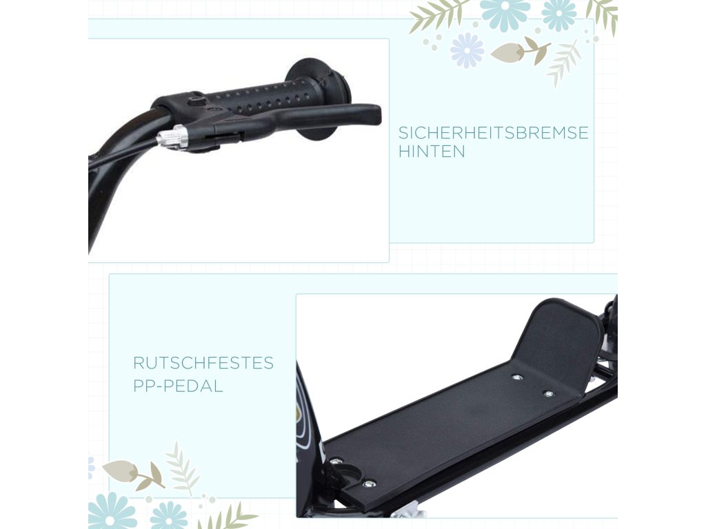 - Spousta zábavy při jízdě: Pokud jezdíte rychle, musíte také občas zabrzdit. Pro bezpečné zastavení koloběžky byla nainstalována brzda zadního kola a opěrka nohou.