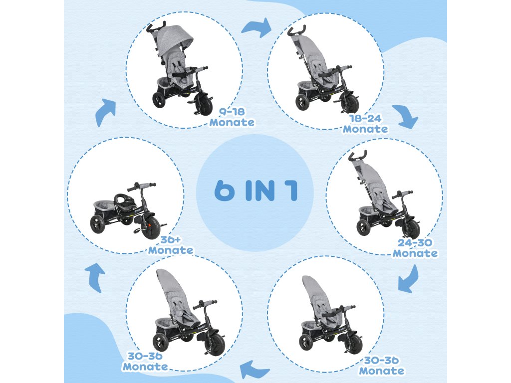 - použití 6 v 1: Univerzální tříkolka, lze ji použít jako dětský kočárek, tlačná tříkolka, tréninkové kolo, samostatné kolo (s polštářkem), samostatné kolo (bez polštářku) a samostatná tříkolka (bez opěrky). Nabízí vašemu dítěti bezpečí a pohodlí v každé fázi růstu.