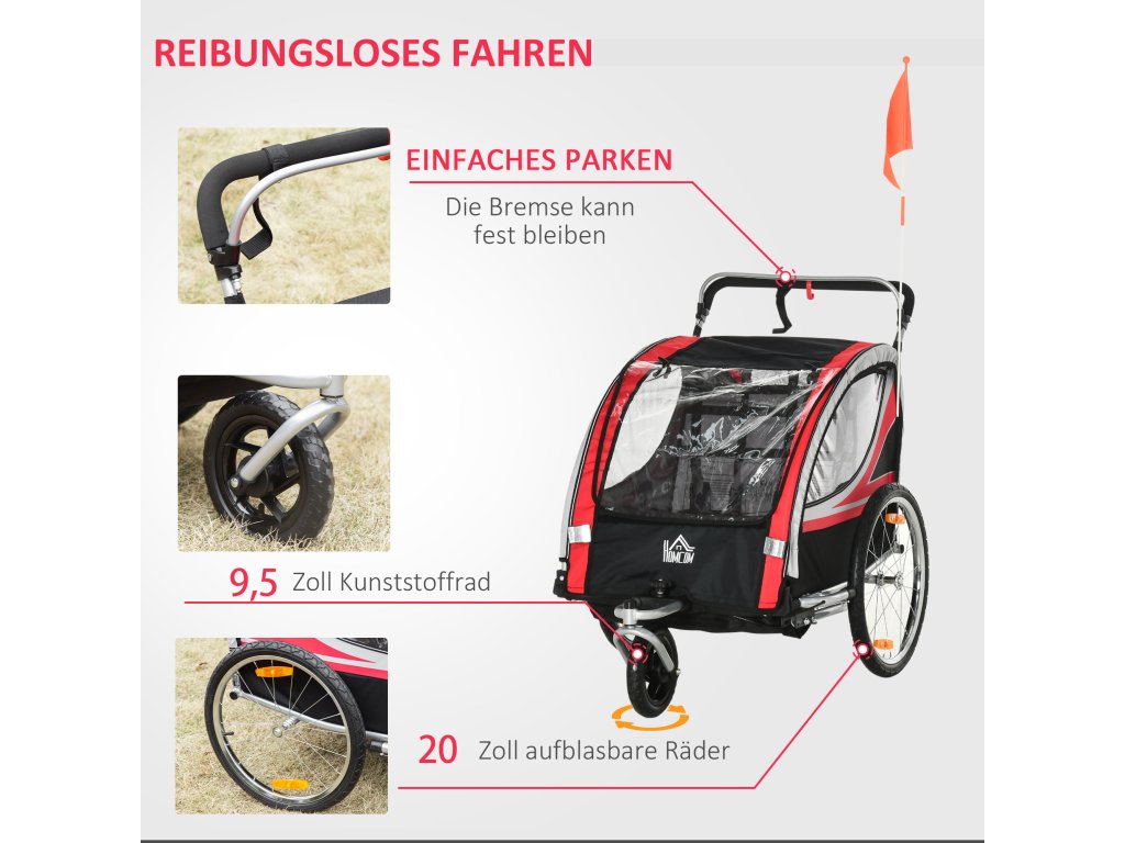- Vždy v bezpečí na cestách: Dvě 20palcová zadní kola přívěsu na kolo plněná vzduchem zajišťují plynulou jízdu i na nerovném terénu. Brzdy na zadních kolech zvyšují bezpečnost, zatímco odrazky a vlaječky zajišťují dobrou viditelnost