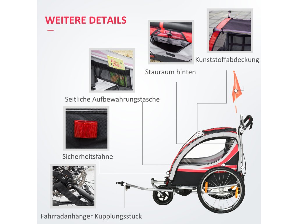 - přívěs 2 v 1: Tento multifunkční přívěs lze odejmutím předního kola přeměnit na dětský přívěs. Díky praktickým rychloupínacím pákám na zadních kolech je lze rychle odejmout a dětský přívěs kompaktně uložit