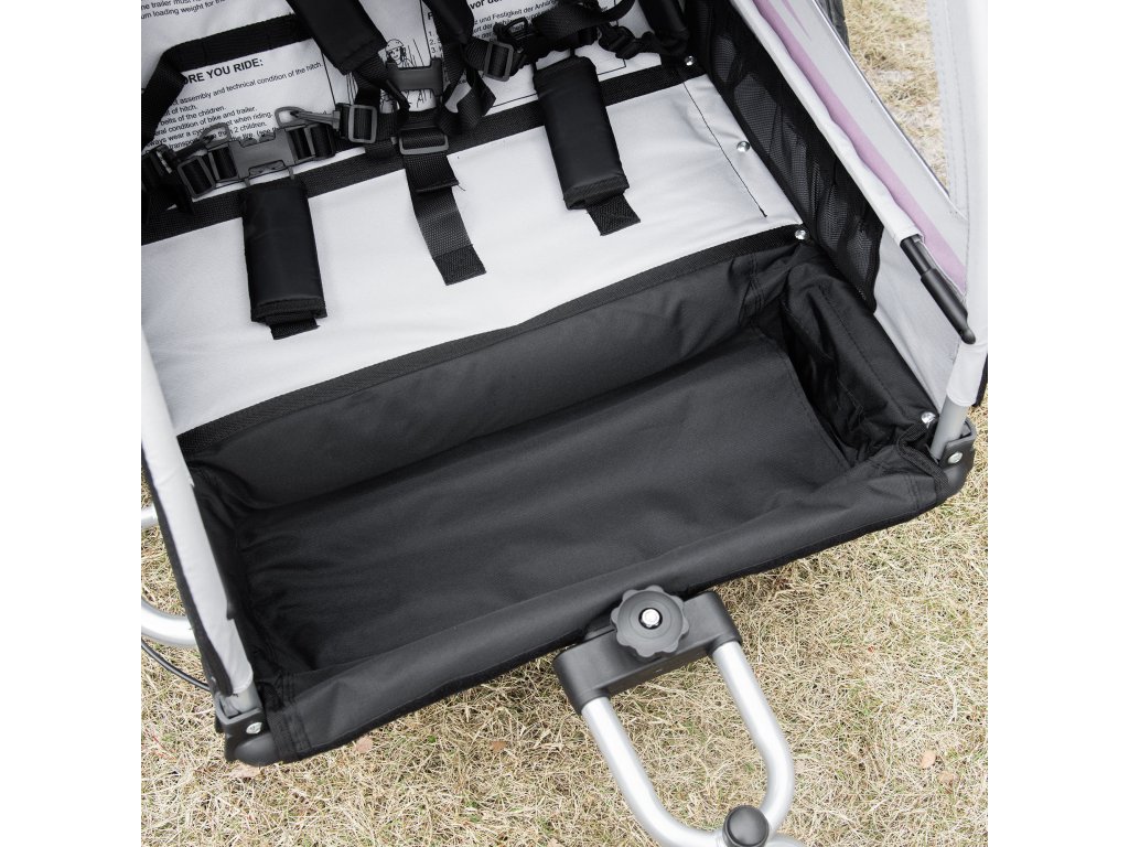 - Robustní konstrukce: Robustní kovový rám potažený textilní plachtou zaručuje stabilitu a odolnost dětského přívěsu. Pětibodové bezpečnostní pásy navíc zajišťují, že vaše děti budou vždy sedět bezpečně a pohodlně