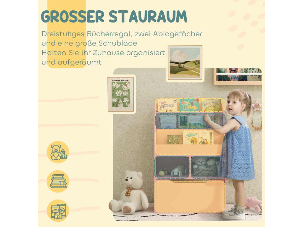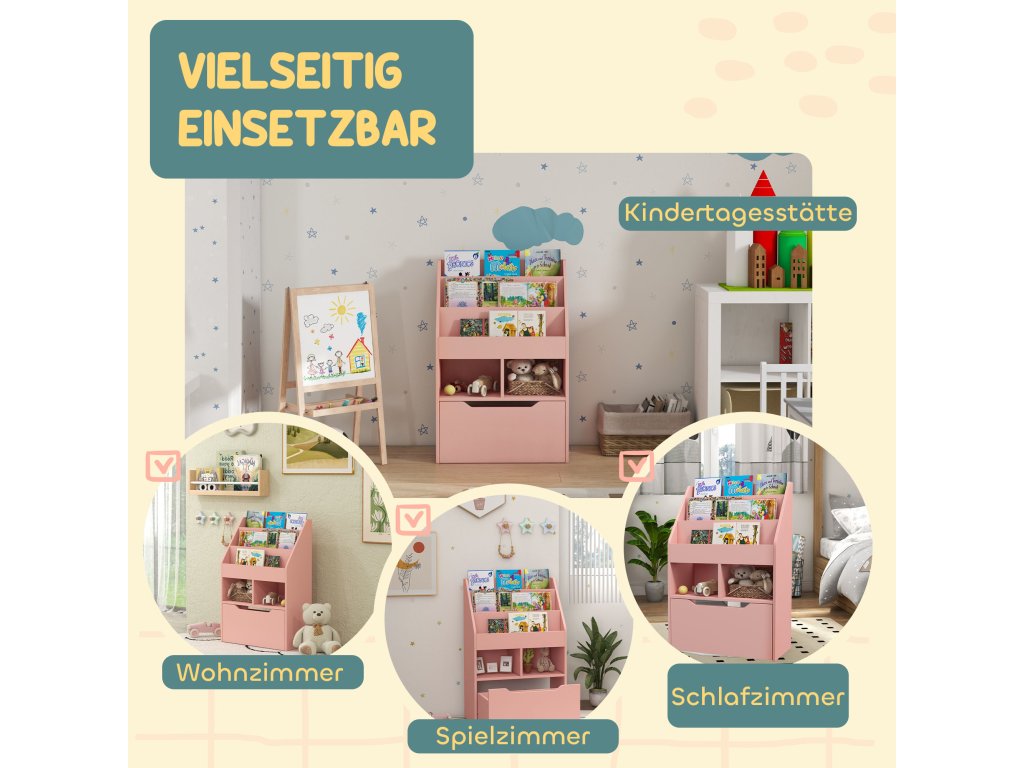 HOMCOM Dětský regál se zásuvkou, regál s přihrádkami, 60 x 29,9 x 90 cm, růžová barva