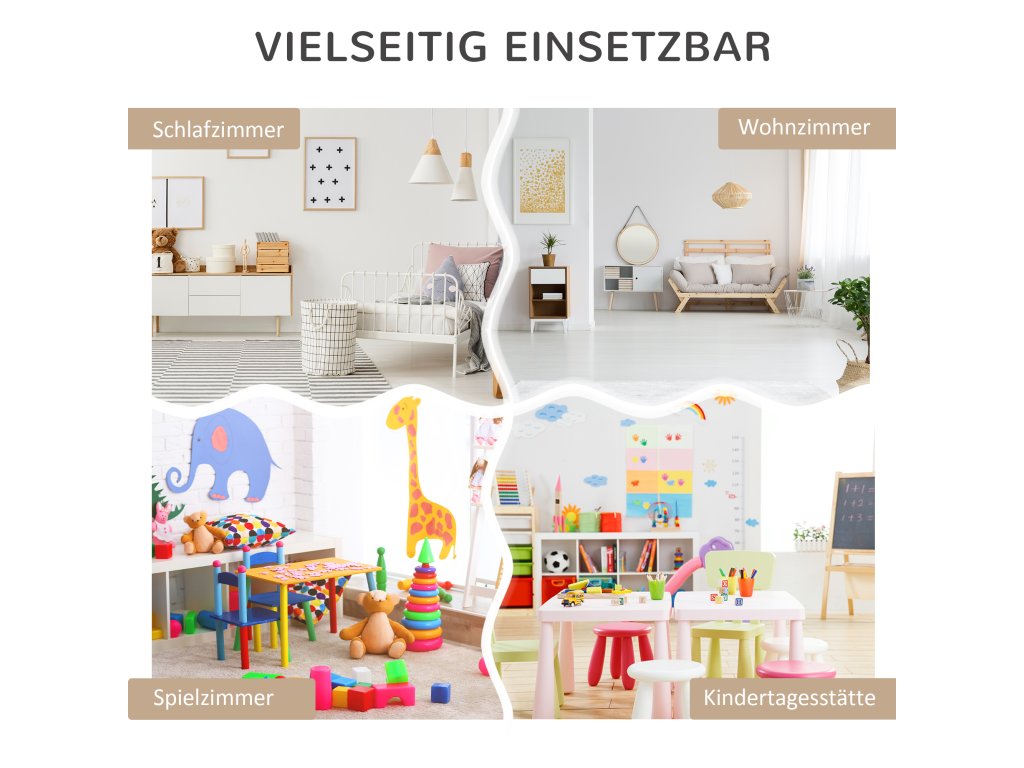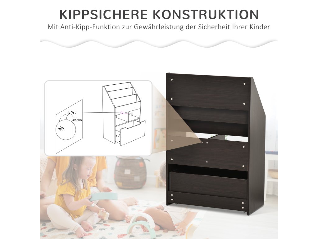 - Se zařízením proti překlopení: Zařízení proti překlopení na zadní straně dětského regálu poskytuje dodatečnou stabilitu a zajišťuje bezpečnost používání. Hladké zaoblené hrany jsou pro vaše děti velmi přívětivé.