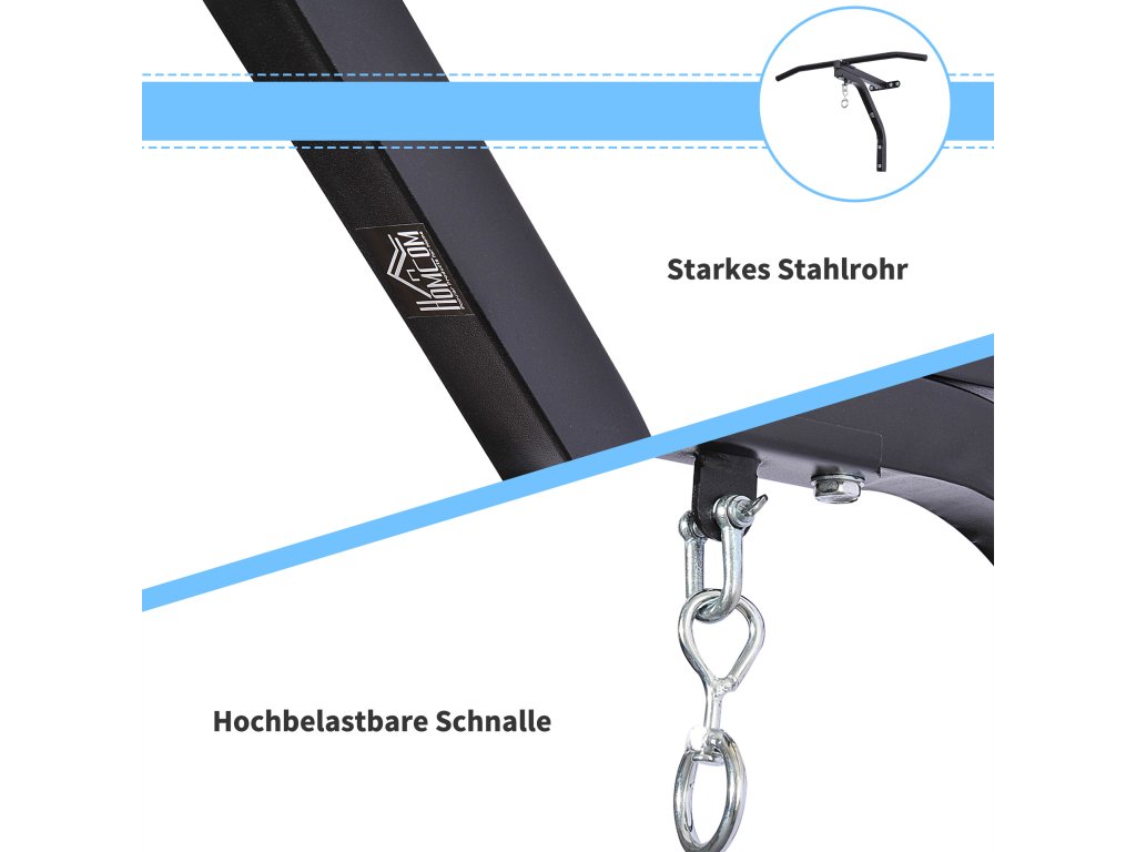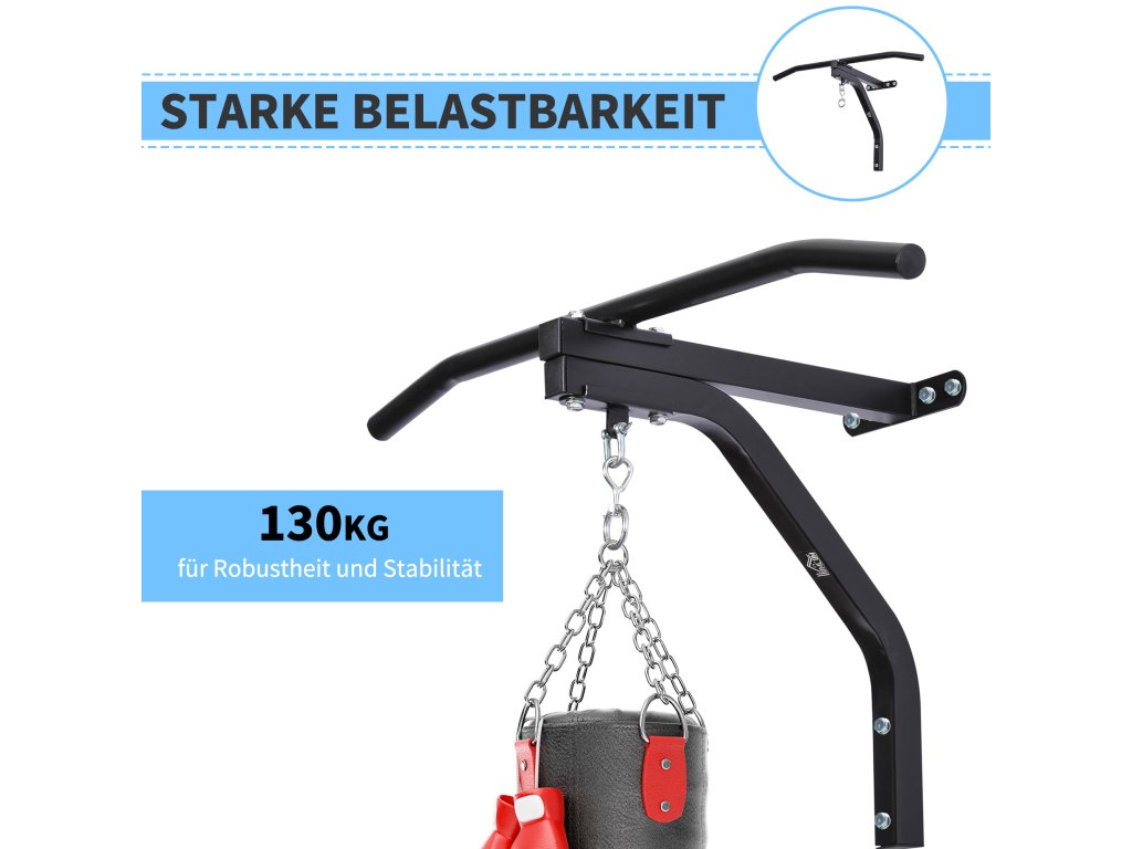 - VYSOKÁ KVALITA A PEVNOST: Náš věšák na boxovací pytel má zesílenou, práškově lakovanou ocelovou konstrukci, která unese hmotnost až 130 kg.