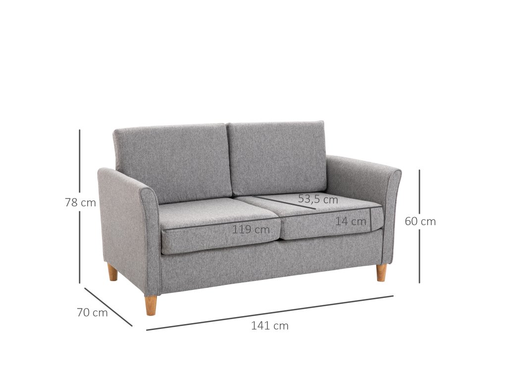 HOMCOM® Dvoumístná pohovka | Vyjímatelné polštáře | Len, pěna, kaučukové dřevo | Světle šedá | 141 x 70 x 78 cm