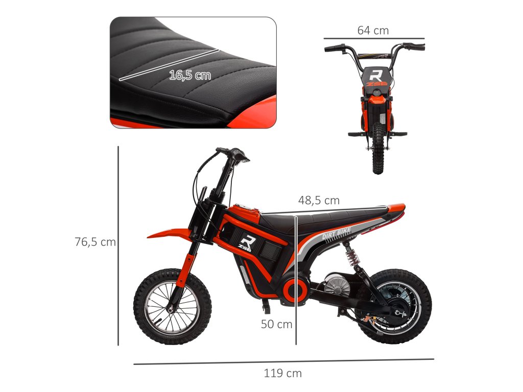- Údaje o výrobku pro elektrickou motorku: Celkové rozměry: 119L x 64W x 76,5V cm. Nosnost: 65 kg. Nutná montáž: Délka: 1,5 m. Doporučený věk: 8-12 let