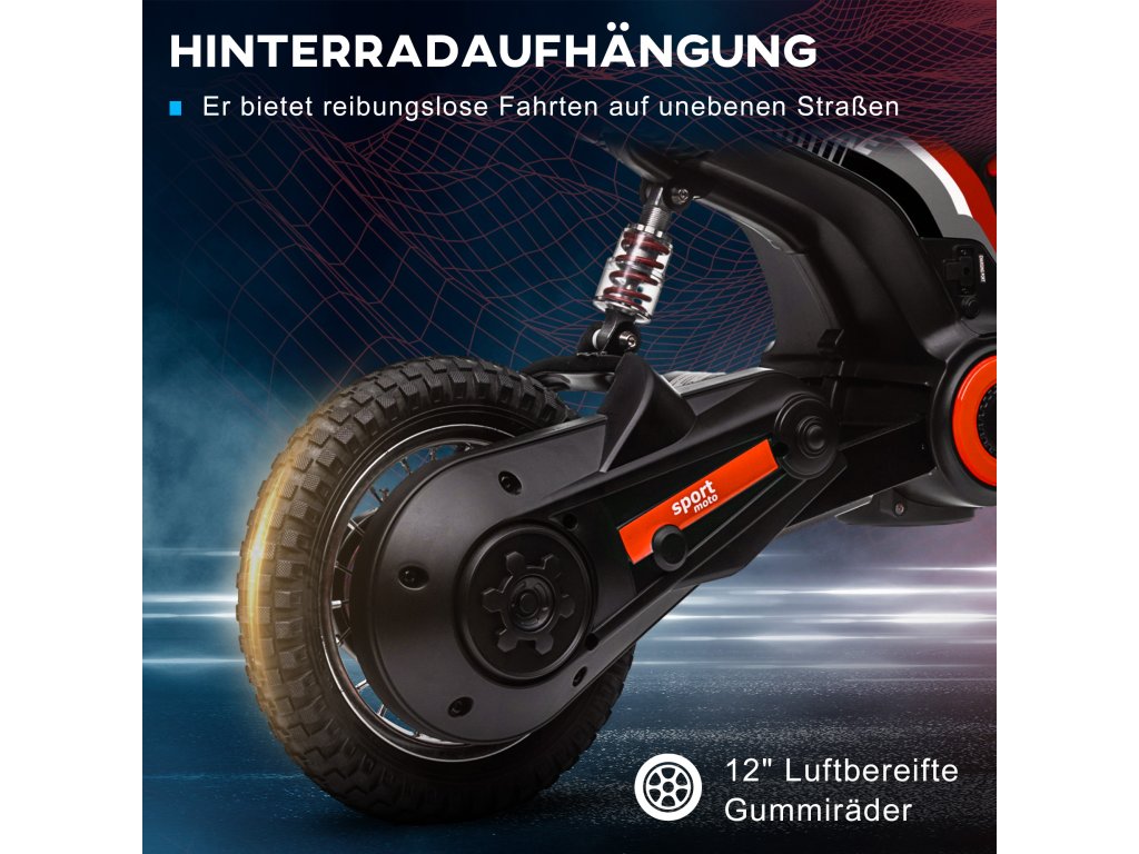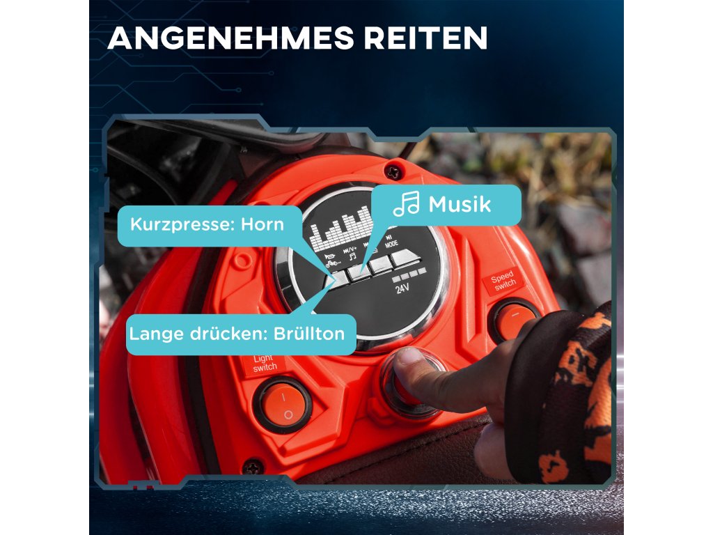 - Vestavěná zábava: Hudební funkce, klaksony a realistický zvuk motoru elektrické motorky poskytují autentický zážitek z jízdy, který vaše děti nadchne