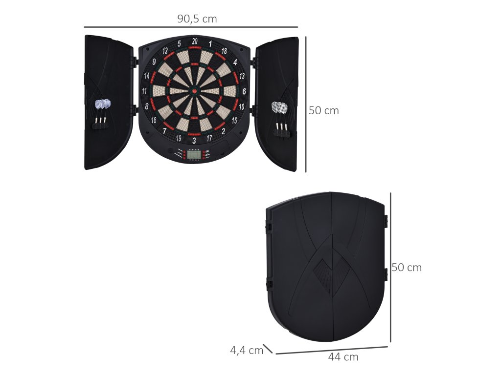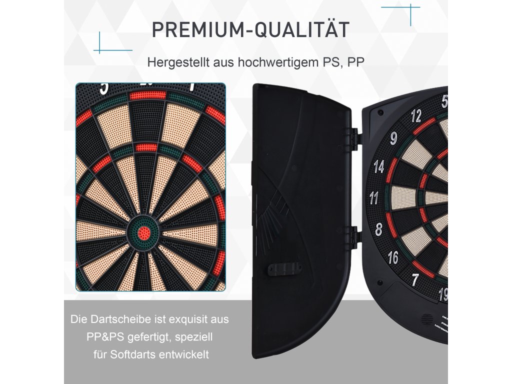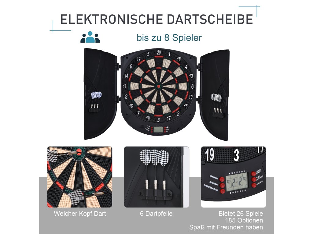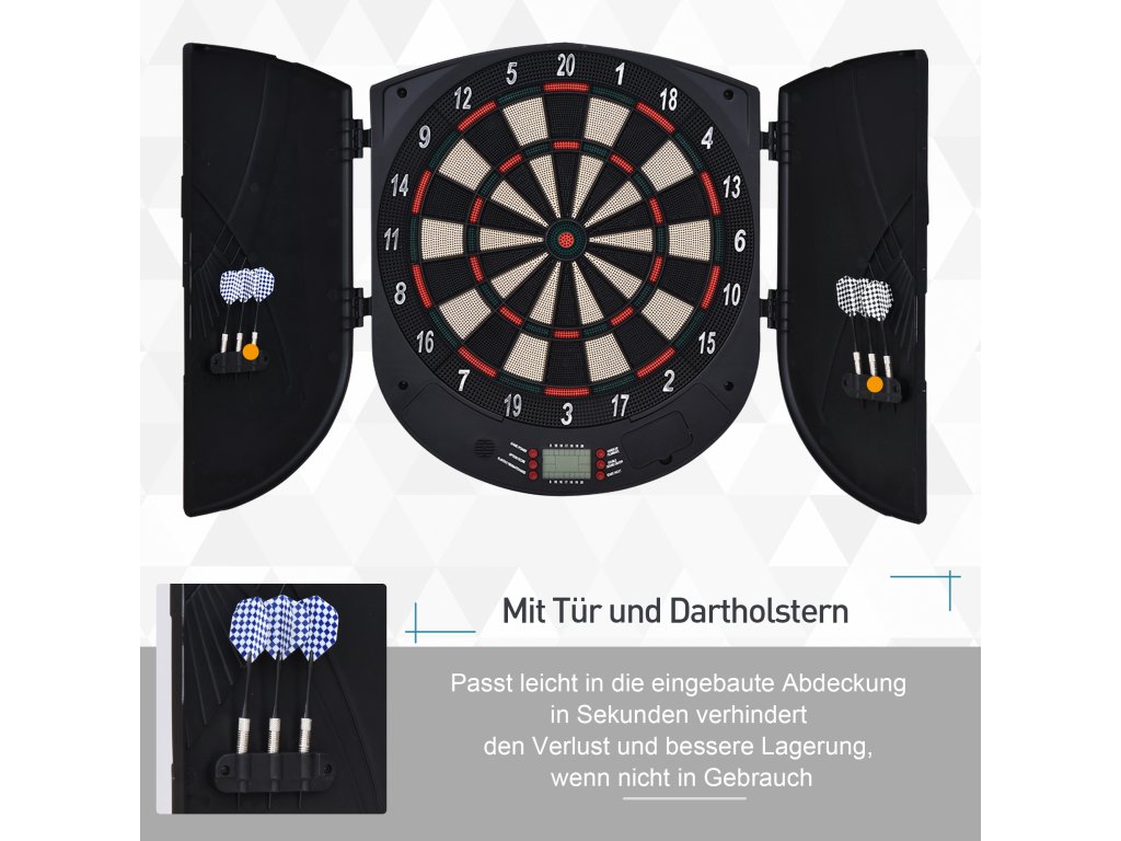 HOMCOM Elektronický šipkový automat Šipky s hlasovým hlášením Anglické hlasové LED displeje 6 šipek 26 her 185 variant Šipkový automat s dvířky Šipkový set až pro 8 hráčů