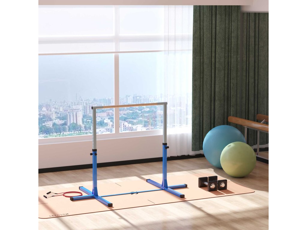 HOMCOM gymnastická vodorovná tyč, výškově nastavitelná vodorovná tyč s 13 stupni, vodorovná tyč ze dřeva a robustní ocelové konstrukce, nosnost až 75 kg, pro děti 3+, vnitřní, venkovní, modrá barva