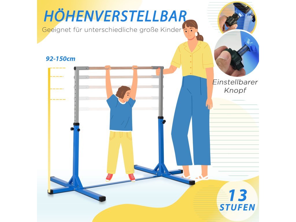 - Roste s vaším dítětem: Tato horizontální tyč roste s vaším dítětem a nevyžaduje upgrade - je nastavitelná do 13 výšek od 92 cm do 150 cm, a to v jednoduchých krocích po 4,8 cm. Vyberte si vhodnou výšku pro začátečníky i zkušené gymnasty