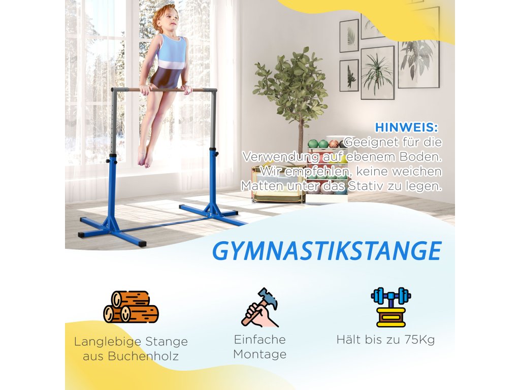 Naše gymnastická tyč HOMCOM je ideální pro trénink vašeho dítěte, ať už doma nebo v tělocvičně. Pogumovaná základna vodorovné tyče zvyšuje stabilitu, chrání podlahu před poškozením a zajišťuje větší bezpečnost. Dopřejte svým dětem tuto tyč, která účinně podpoří jejich flexibilitu, sílu a zdraví.