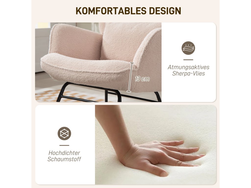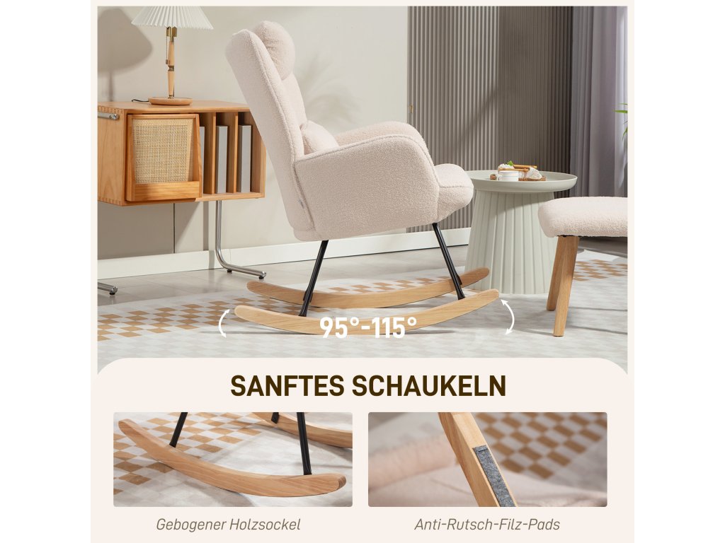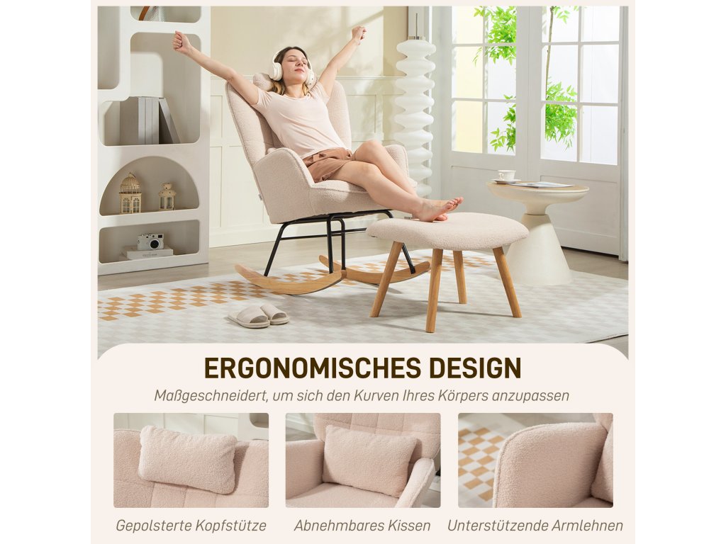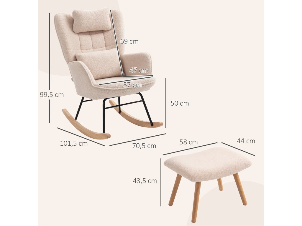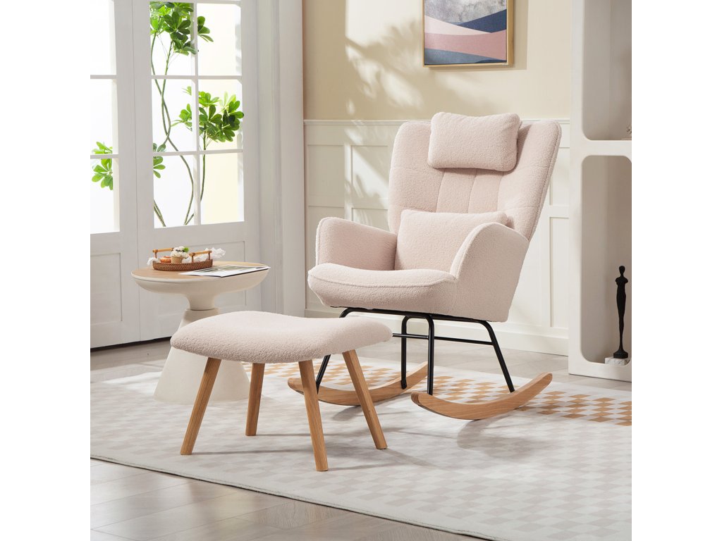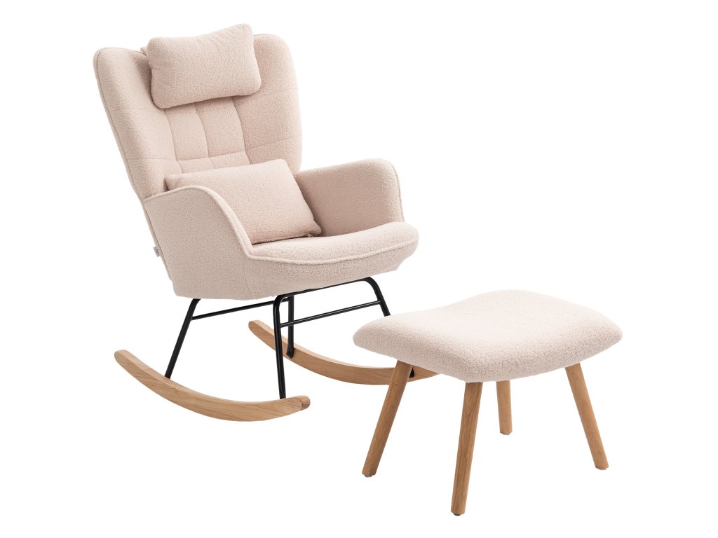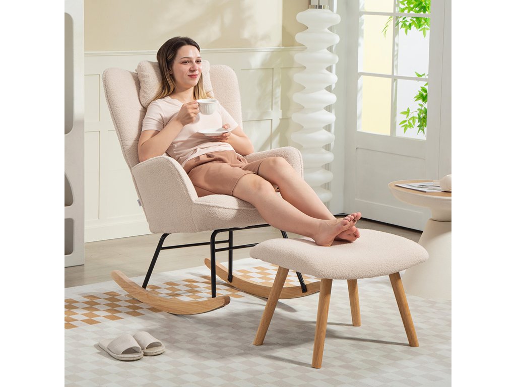 HOMCOM Houpací křeslo s podnožkou, měkký fleecový potah, dřevěné nohy, polštář, vysoké opěradlo, houpací křeslo, béžová barva