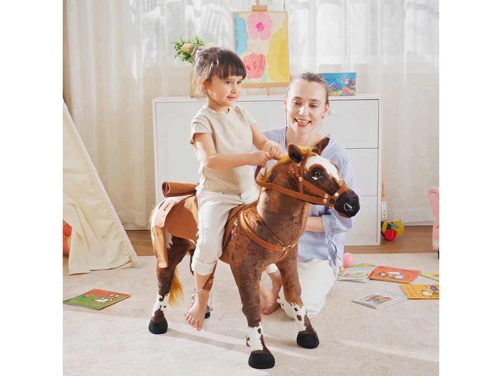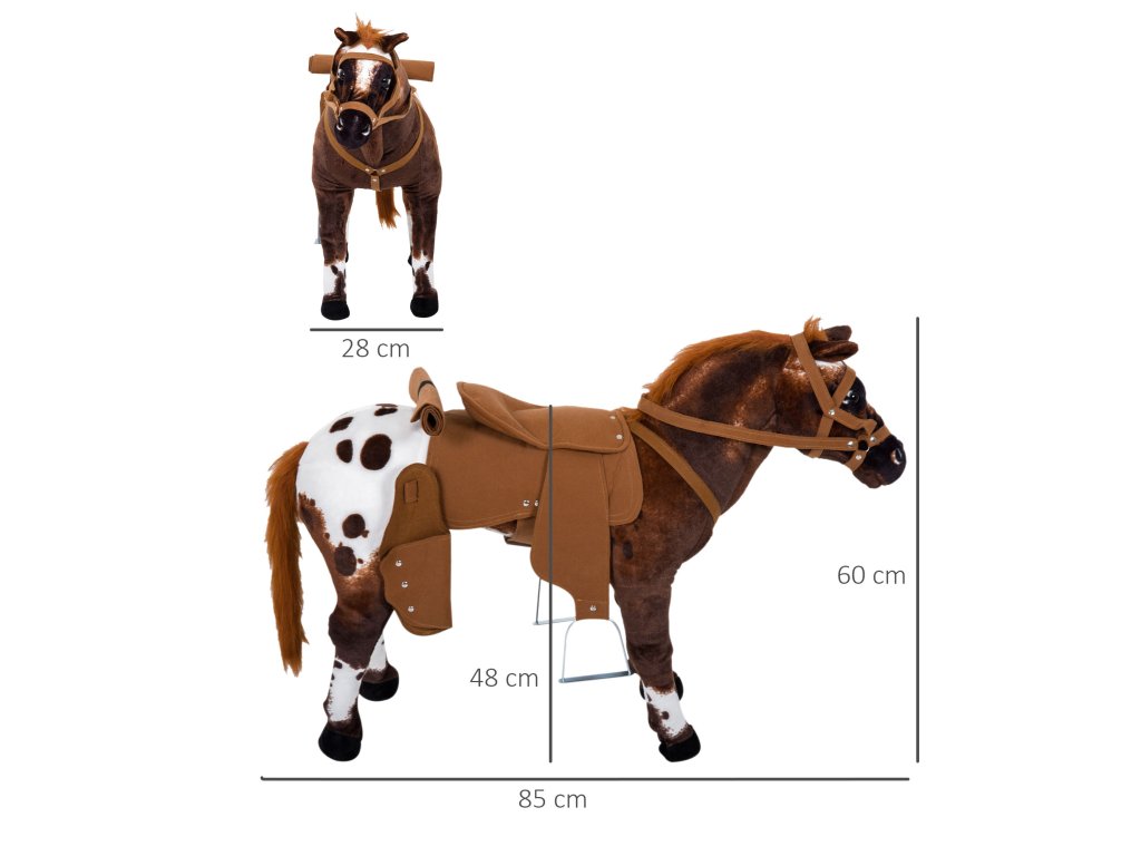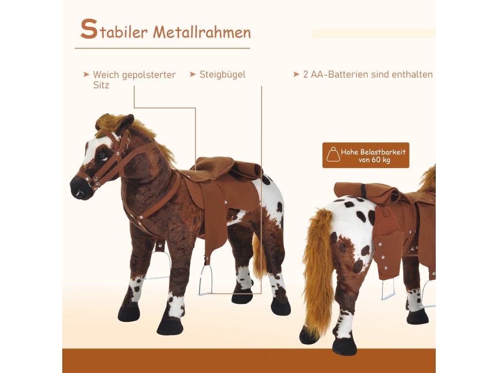 HOMCOM Hrací kůň na koni pro děti od 2 let, měkký plyšový kůň se sedlem a třmeny, hračka koně se zvukem, hnědý