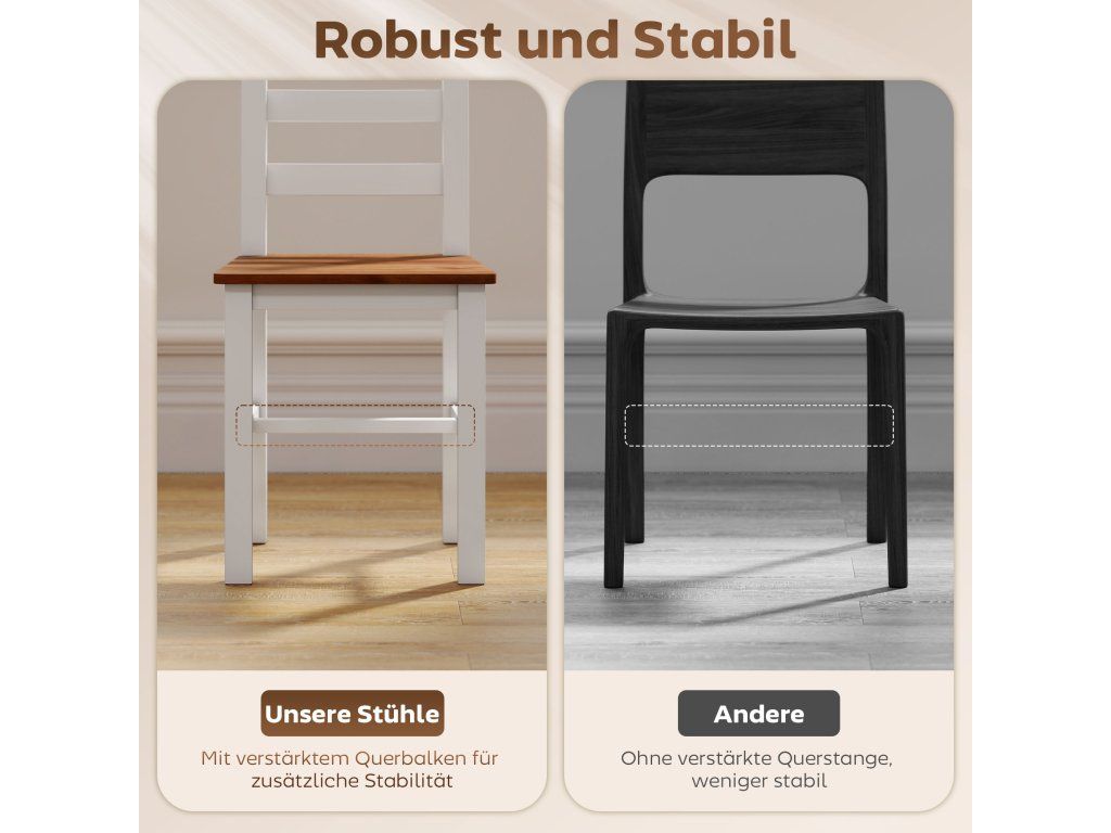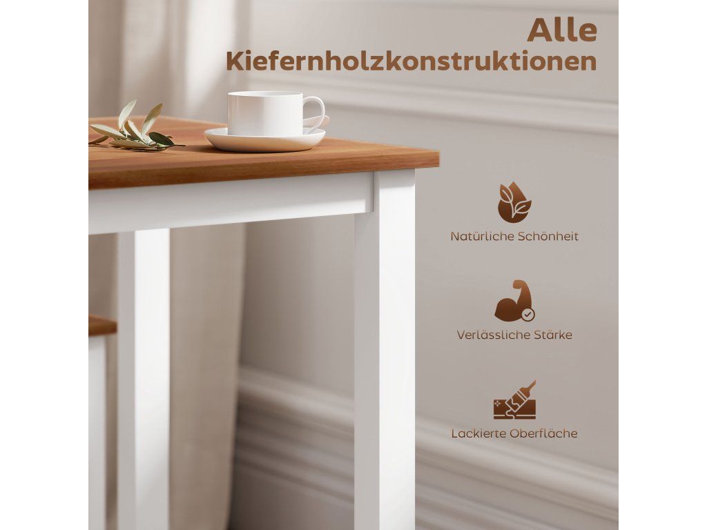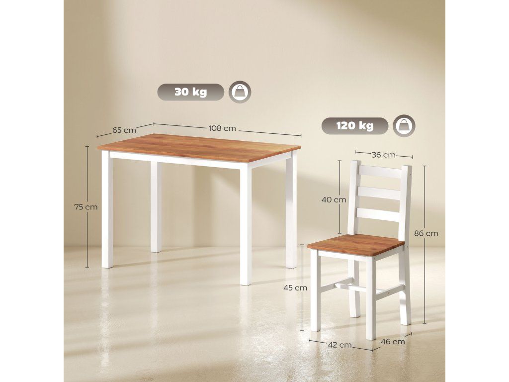 S jídelním setem HOMCOM získáte uklizený jídelní kout, protože židle lze snadno zasunout pod stůl, což je ideální pro malé prostory. Teplá hnědá barva a zářivě bílé nohy vnesou do vaší kuchyně rustikální šarm. Tato sedací skupina je vyrobena z masivního borovicového dřeva a nabízí odolnost a přírodní atmosféru, která stylově obohatí vaše stolování s přáteli a rodinou.