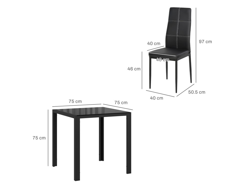 - Rozměry nábytku do jídelny: Stůl: 75L x 75W x 75H cm; židle: 40W x 50,5D x 97H cm. Nosnost: 120 kg pro židle, 50 kg pro malý kuchyňský stůl.