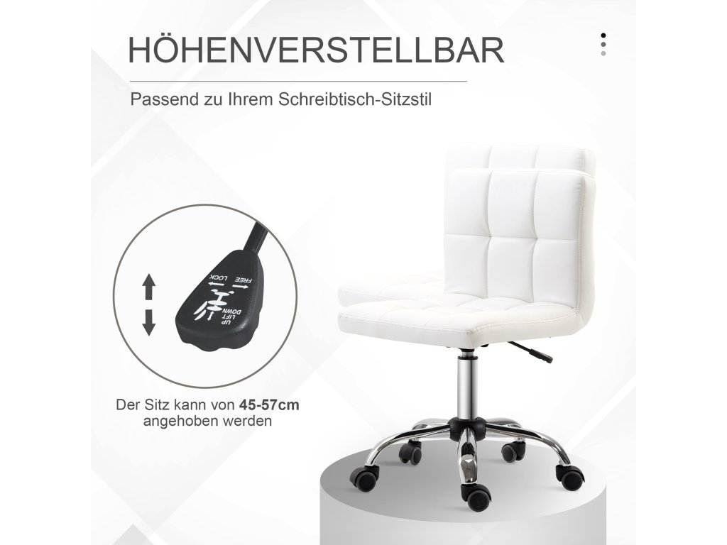Jednoduchá a sofistikovaná - to je elegantní ergonomická židle k počítači. Její design s ocelovou konstrukcí a potahem z bílé umělé kůže nabízí minimalistický vzhled, který je ideální pro každý interiér. Kromě svého stylu je židle k počítači také funkční: Výškově nastavitelný sedák a tichá otočná základna s 5 nylonovými kolečky zajišťují pohodlí a ovladatelnost.