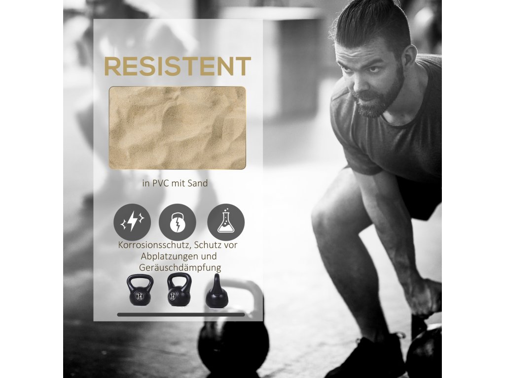 - Robustní plastový rám s pískem: Plastový rám kettlebellu s pískem snižuje korozi, odlamování a hlučnost.