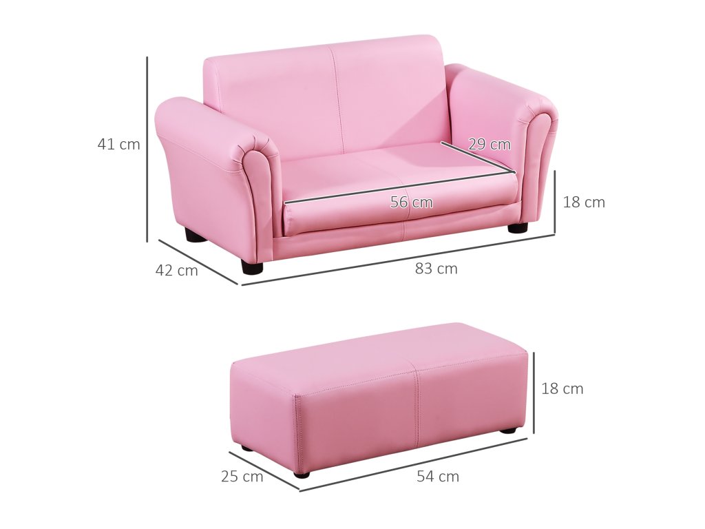 SPECIFIKACE PRODUKTU: Rozměry pohovky: 83D x 42Š x 41V cm; Rozměry podnožky: 54D x 25Š x 18V cm; Nosnost pohovky: 60 kg; Nosnost podnožky: 40 kg. Vhodný věk: 1,5-3 roky.