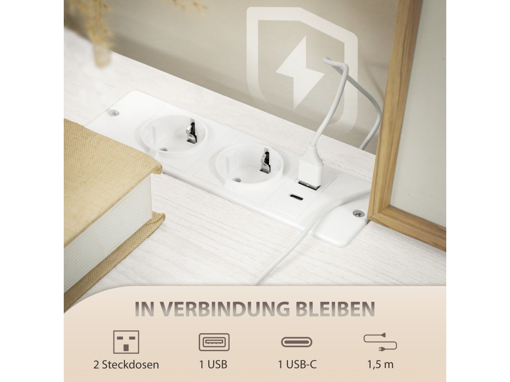 - ✔ Dvě zásuvky, jeden port USB a jeden port USB-C pro pohodlné nabíjení zařízení, s 1,5m napájecím kabelem