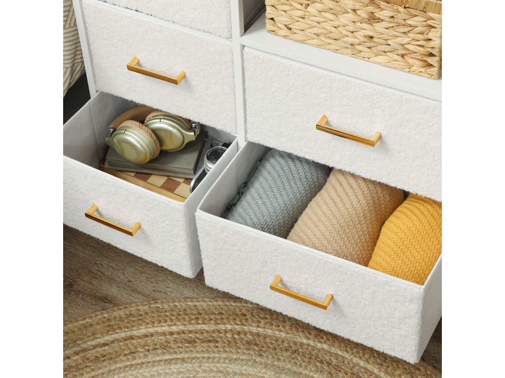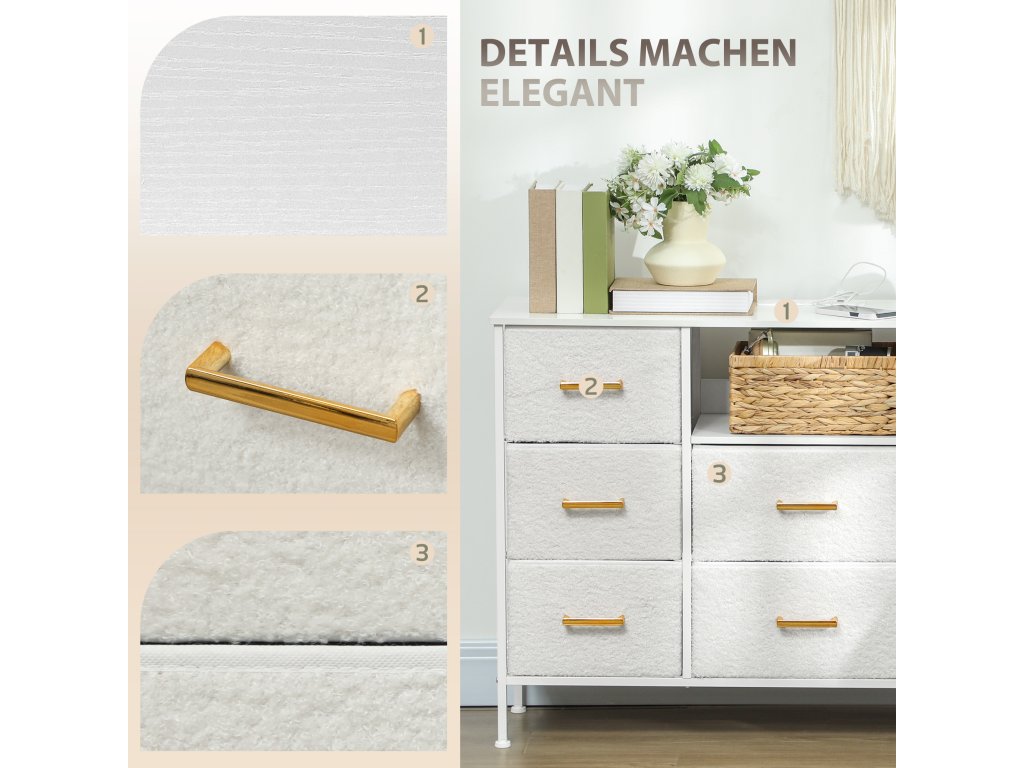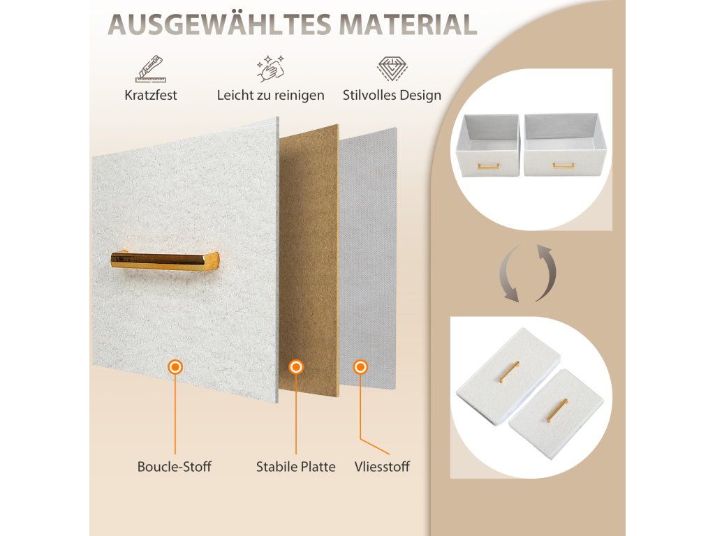 - Elegantní design: Tato úložná komoda se zásuvkami má luxusní látkový povrch bouclé, elegantní úchytky ve zlaté barvě a povrch s 3D strukturou, který vylepší každý obývací pokoj, ložnici, předsíň nebo vstupní prostor a vytvoří hřejivou a příjemnou atmosféru.