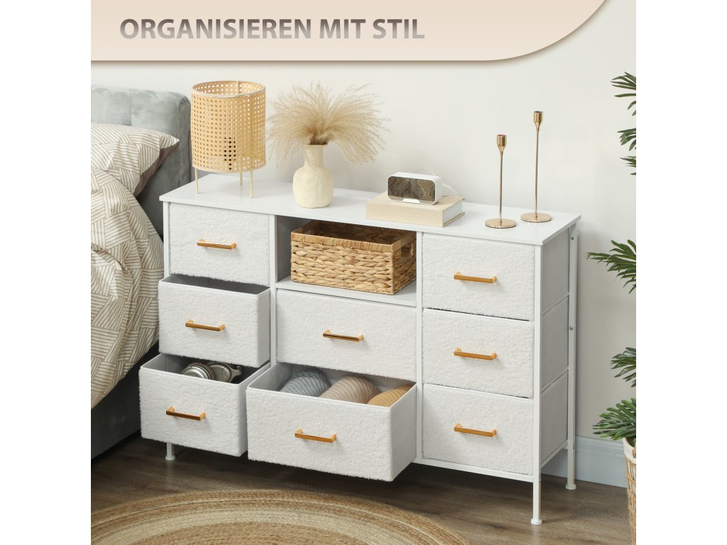 HOMCOM Komoda, úložná skříňka s 8 látkovými zásuvkami, zásuvková lišta, ocelový rám, zásuvková skříňka do předsíně, ložnice, obývacího pokoje a kanceláře, krémově bílá