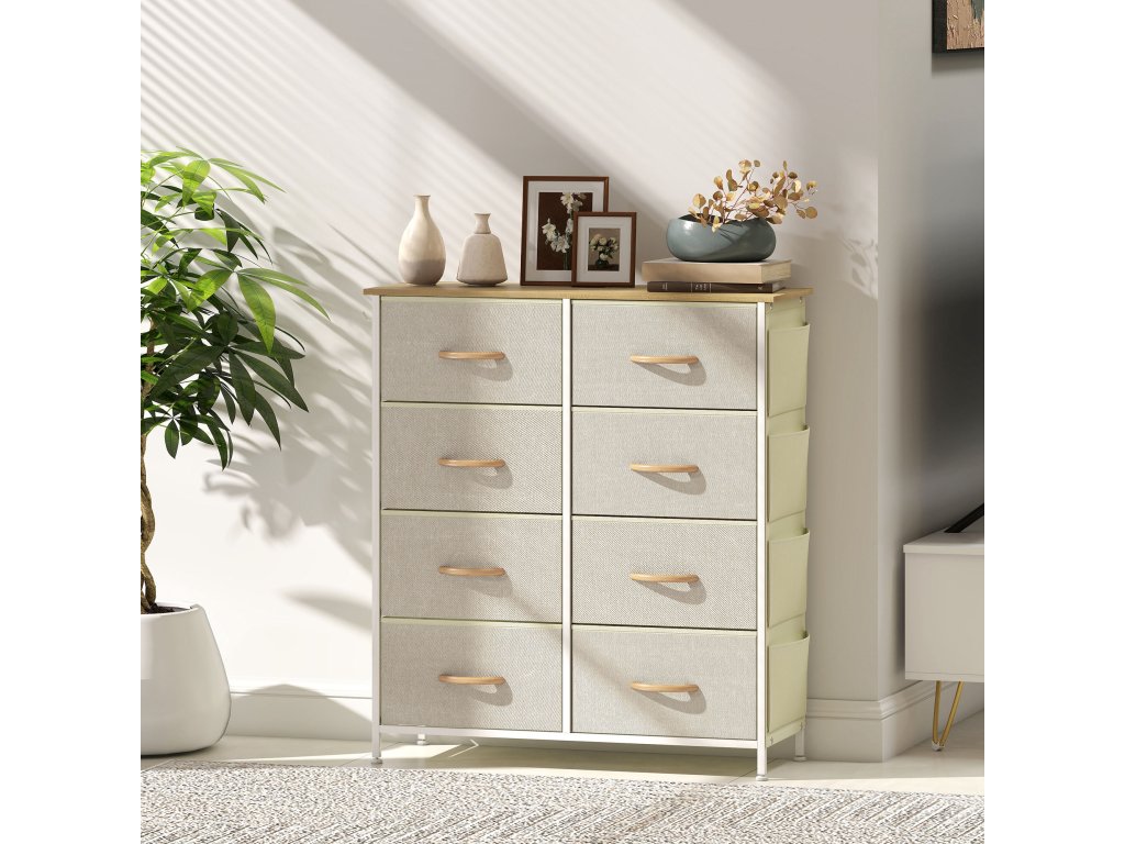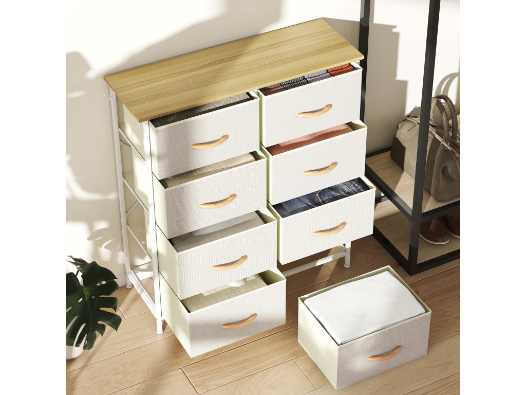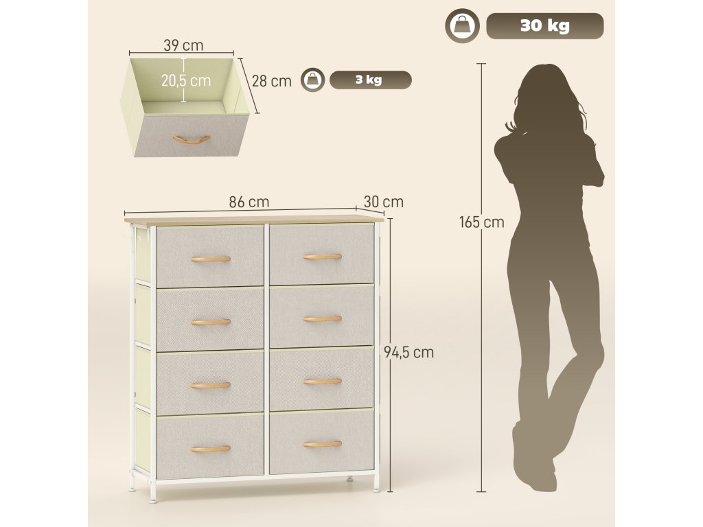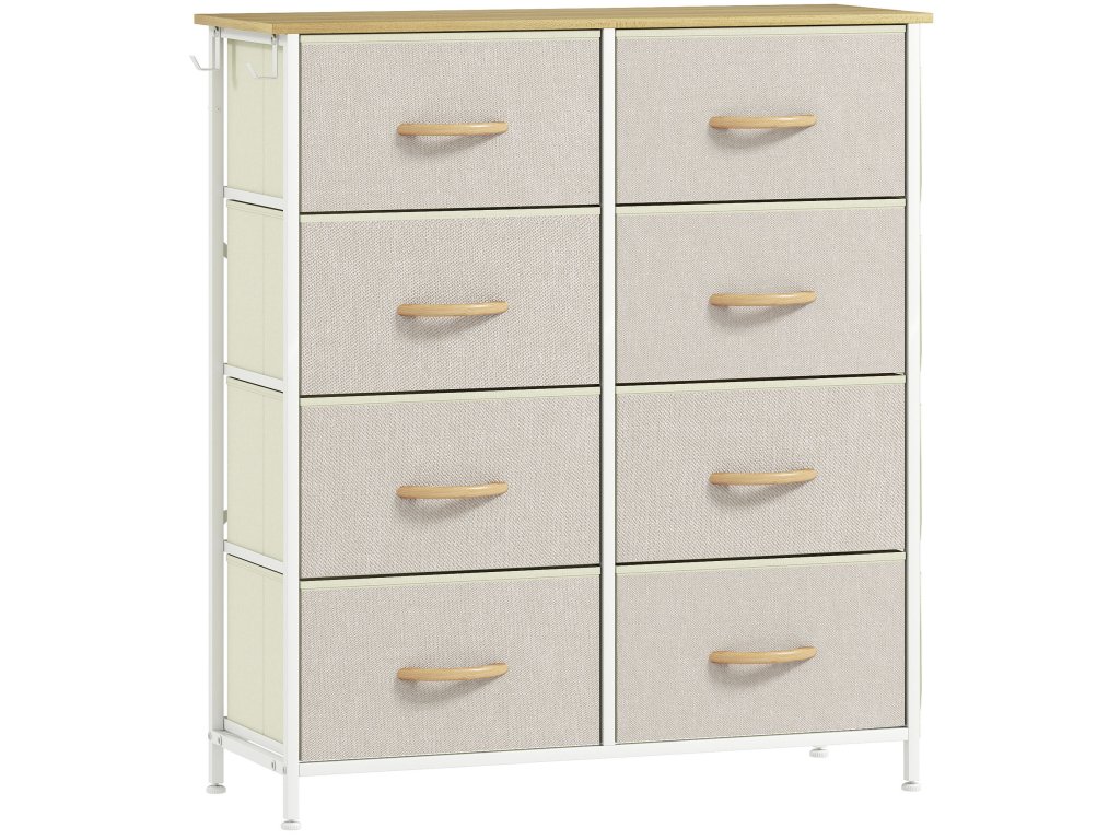 HOMCOM Komoda do ložnice s 8 látkovými zásuvkami, ocelové vzpěry, dřevěný povrch, 4 úložné kapsy, 2 háčky, béžová barva