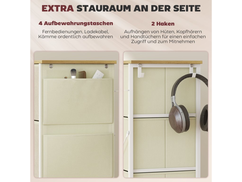 - Další boční úložné prostory: Tato komoda je vybavena čtyřmi úložnými kapsami a dvěma háčky a poskytuje rychlý přístup k dálkovým ovladačům, nabíjecím kabelům, čepicím, sluchátkům, klíčům a dalším každodenním nezbytnostem