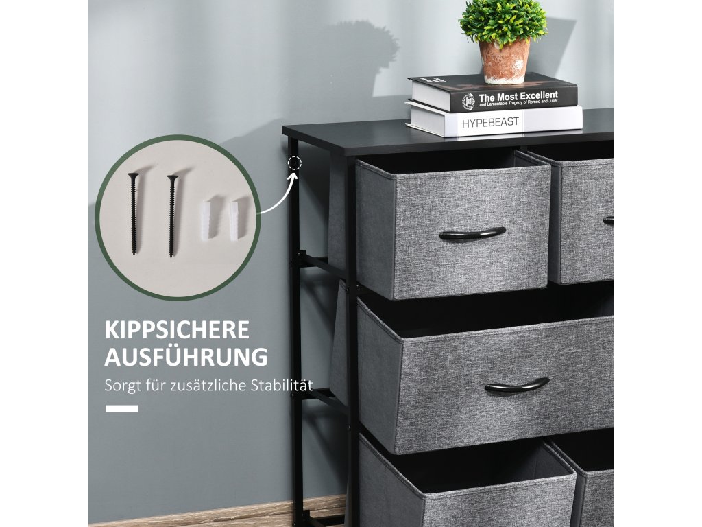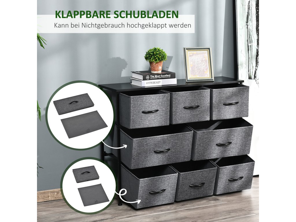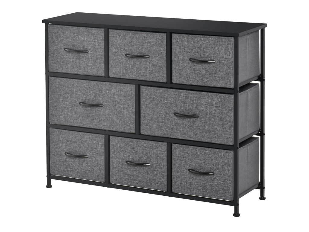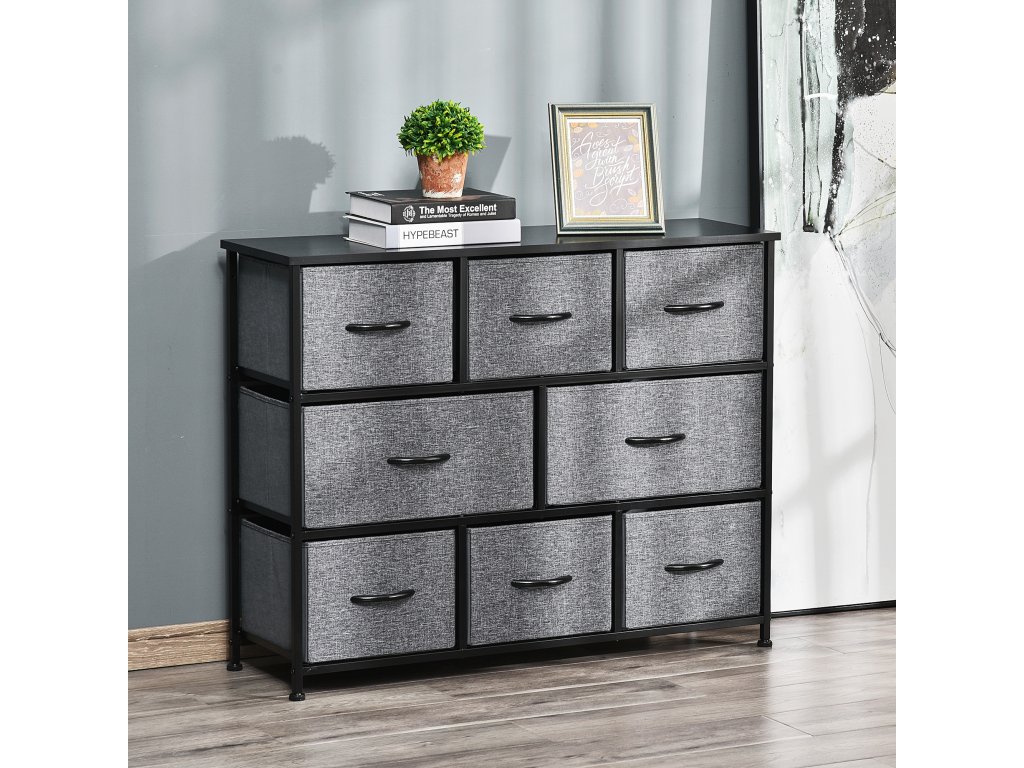 HOMCOM Komoda s 8 látkovými zásuvkami, 2 velké, 6 malých, kovový rám, ochrana proti překlopení, šedá barva