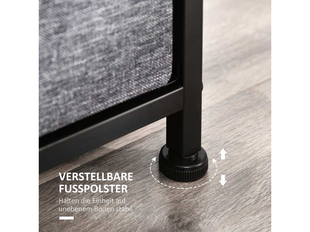- Robustní konstrukce: Pevný kovový rám a horní deska z MDF zajišťují vynikající stabilitu a odolnost. Nastavitelné podložky pod nohy vyrovnávají nerovnosti, stabilizují komodu a chrání podlahu před poškozením