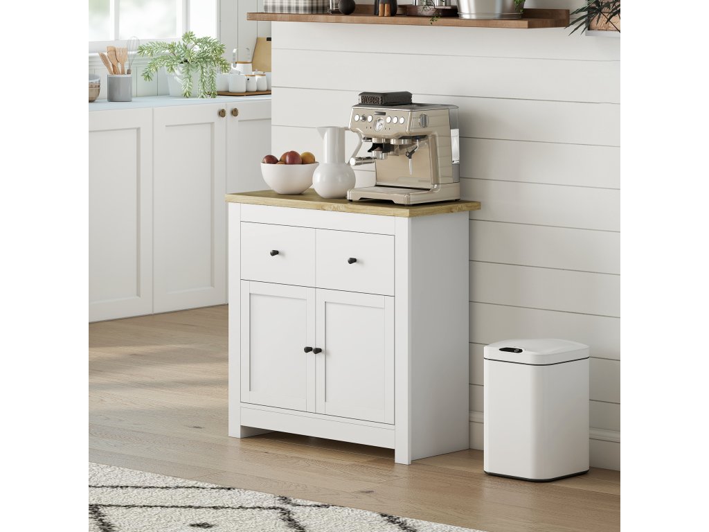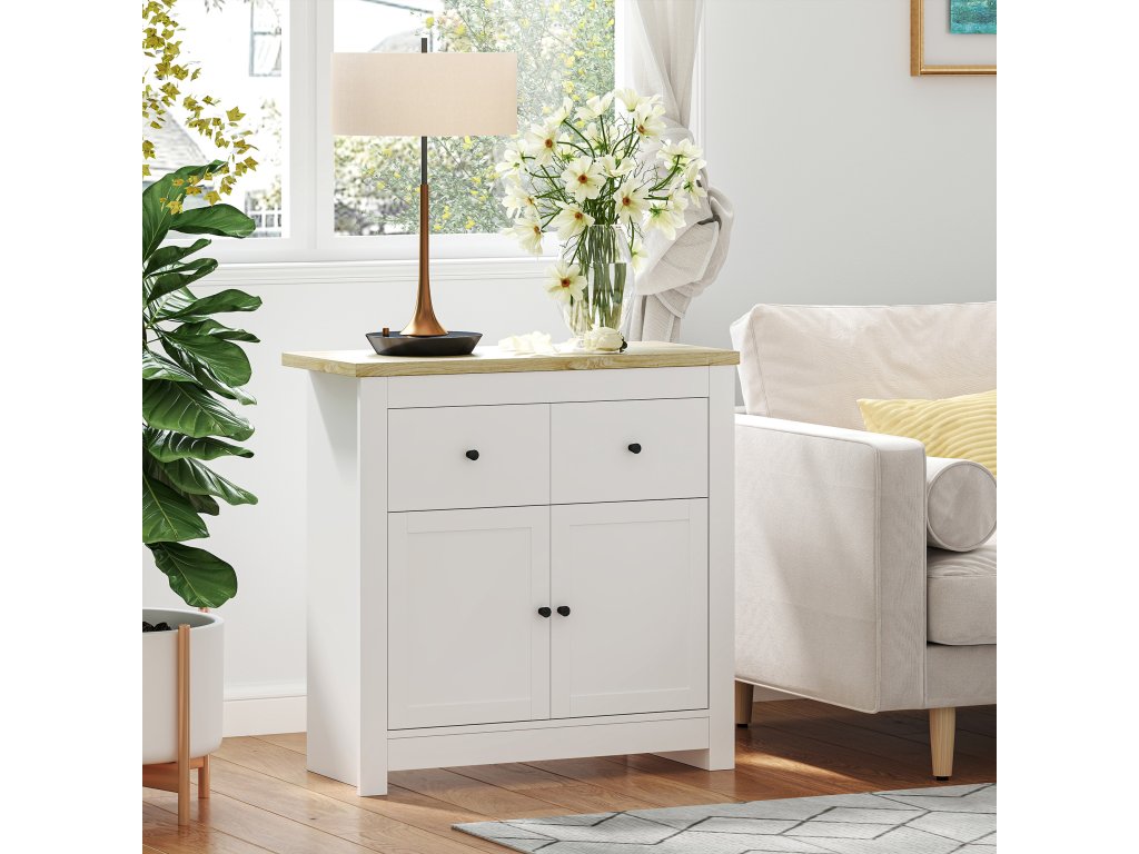 Optimalizujte svůj obývací prostor pomocí této komody, která vám zajistí stylovou organizaci. Dvě hladce posuvné zásuvky a prostorná dvoudveřová skříňka nabízejí dostatek úložného prostoru. Elegantní dvoubarevný design boční skříňky dokonale zapadne do každého interiéru a je ideální do obývacího pokoje, kuchyně, předsíně nebo jídelny. Skvěle se hodí k vystavení dekorativních předmětů, uložení domácích potřeb nebo uskladnění občerstvení.