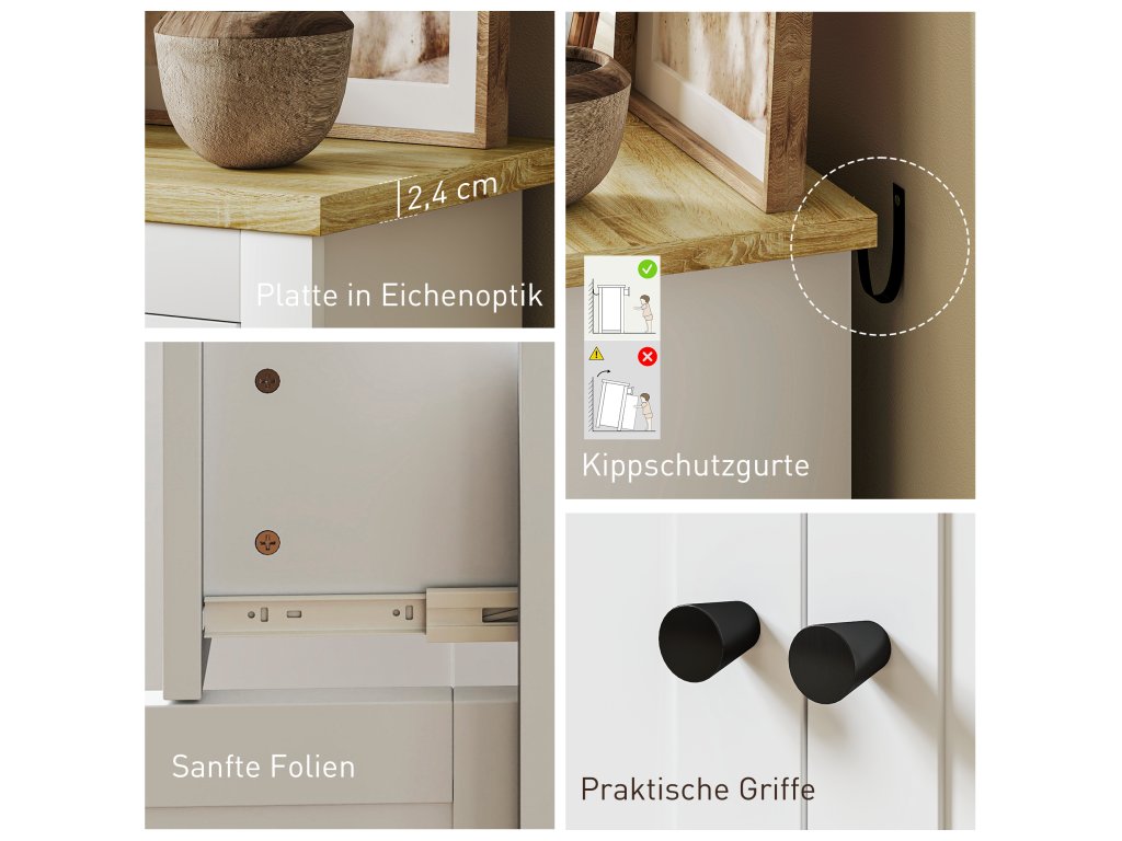 - Stabilita a bezpečnost: Díky pantům s ochranou proti překlopení stojí tento příborník bezpečně a pevně. Stylové a bezpečné úložné řešení, které se jen tak nepřevrátí