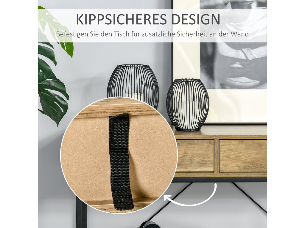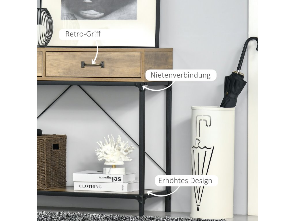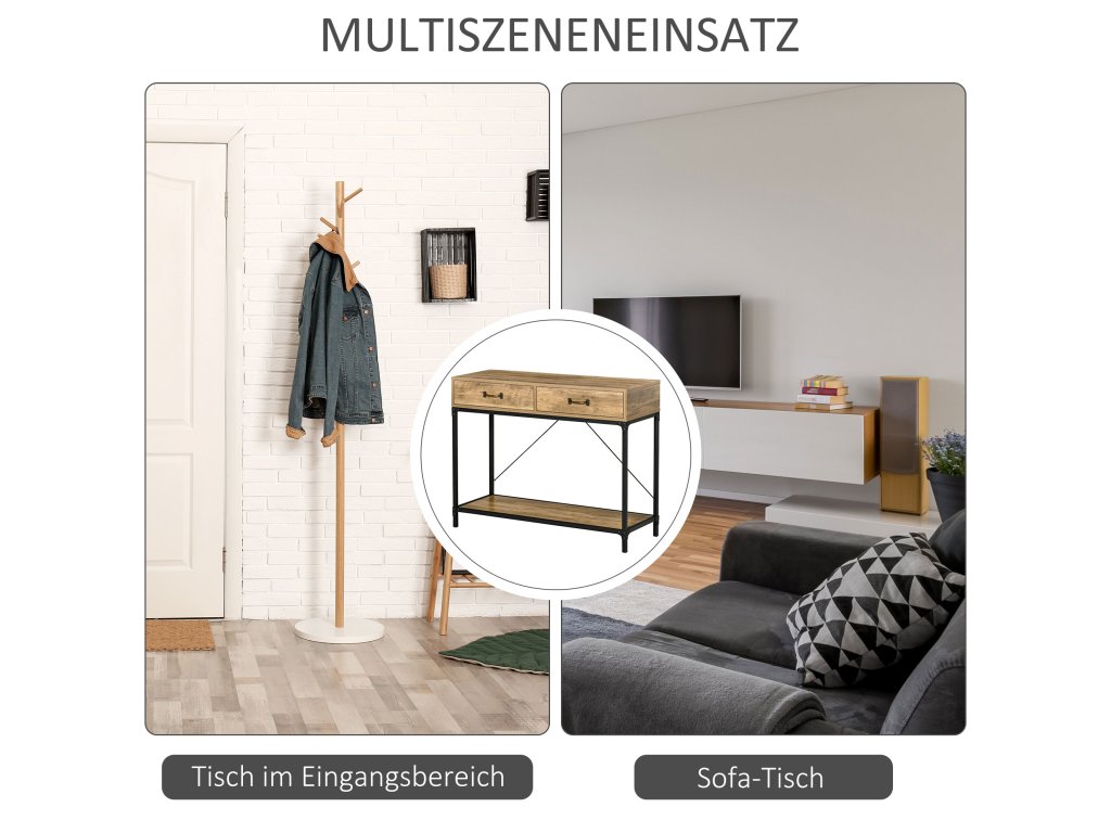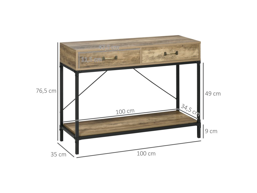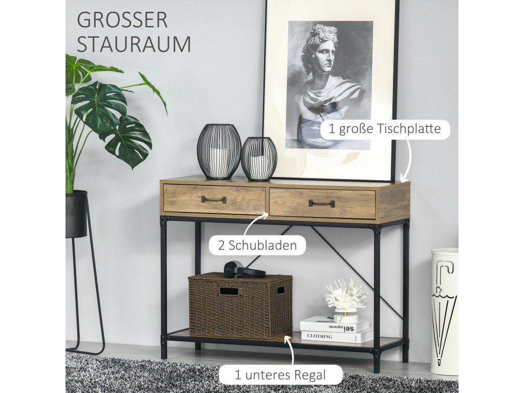 Tato konzole HOMCOM v průmyslovém designu je naprosto trendy. Má 2 výsuvné zásuvky, velkou stolní desku a spodní polici. Konzola vám pomůže udržet pořádek ve vašem předsíňovém prostoru. Díky svému klasickému vzhledu je ideální jako konzola, odkládací stolek nebo prezentační stolek v předsíni. Tato konzola se snadno hodí k mnoha stylům vybavení.