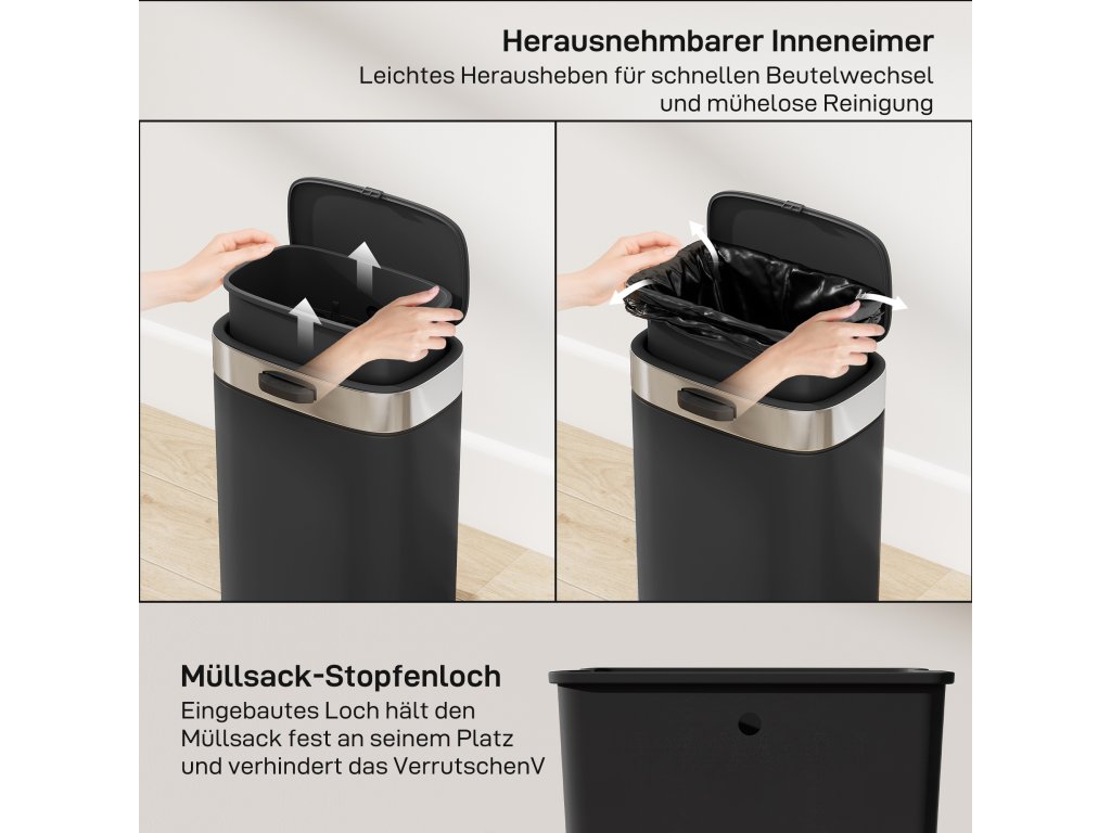 - ✔ Obsahuje vyjímatelný vnitřní koš, díky němuž je likvidace odpadu a čištění mimořádně snadné