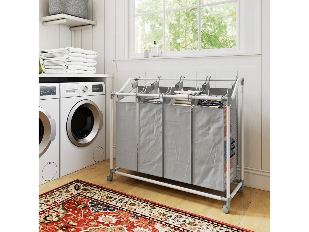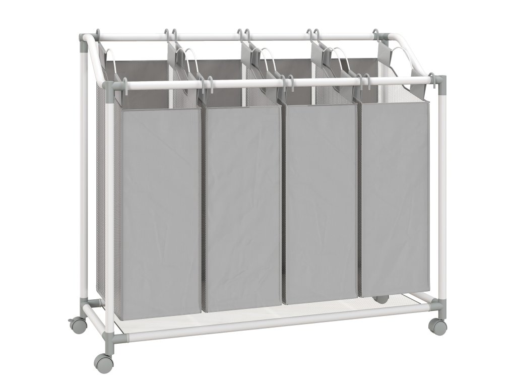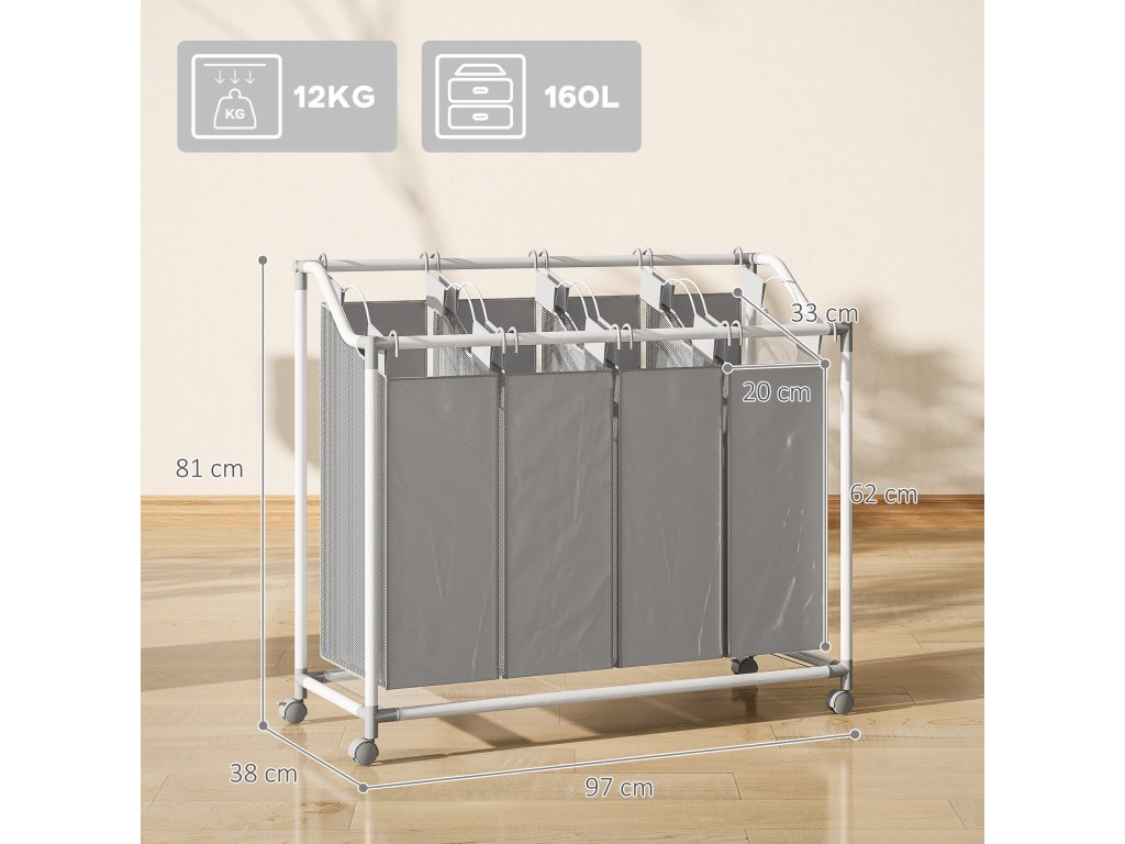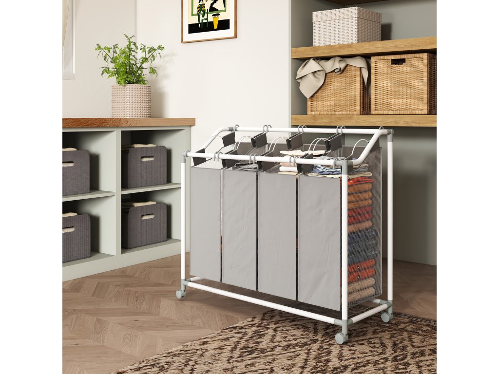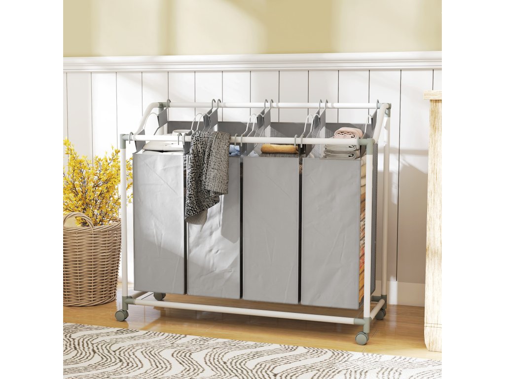Optimalizujte svou prací rutinu s prostorným a stylovým sběračem prádla HOMCOM. Je ideálně navržen pro efektivní třídění a organizaci. Čtyři vyjímatelné látkové vaky koše o objemu 40 l usnadňují rozdělení oblečení podle barev nebo typu. Vaky jsou vyrobeny z lehké, ale odolné tkaniny Oxford a nabízejí každodenní odolnost. Díky čtyřem hladce posuvným kolečkům lze koš na prádlo snadno přemisťovat mezi místnostmi.