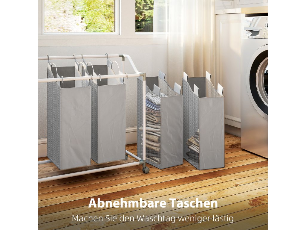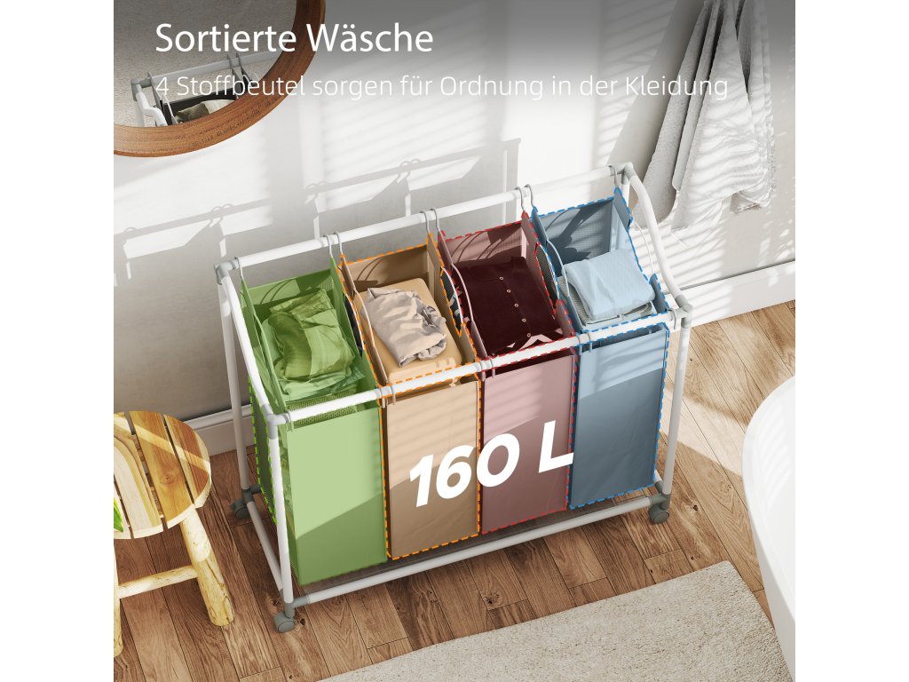 - ✔ Čtyři vyjímatelné kapsy o objemu 40 l (celkem 160 l) koše na prádlo pro snadné třídění prádla