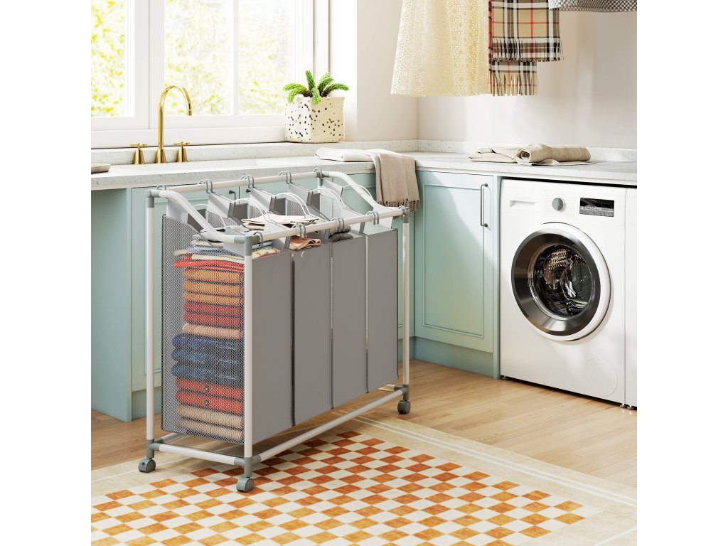 HOMCOM Koš na prádlo se 4 přihrádkami 160 l Koš na prádlo s kolečky, vyjímatelný vak na prádlo, 97 x 38 x 81 cm, šedý