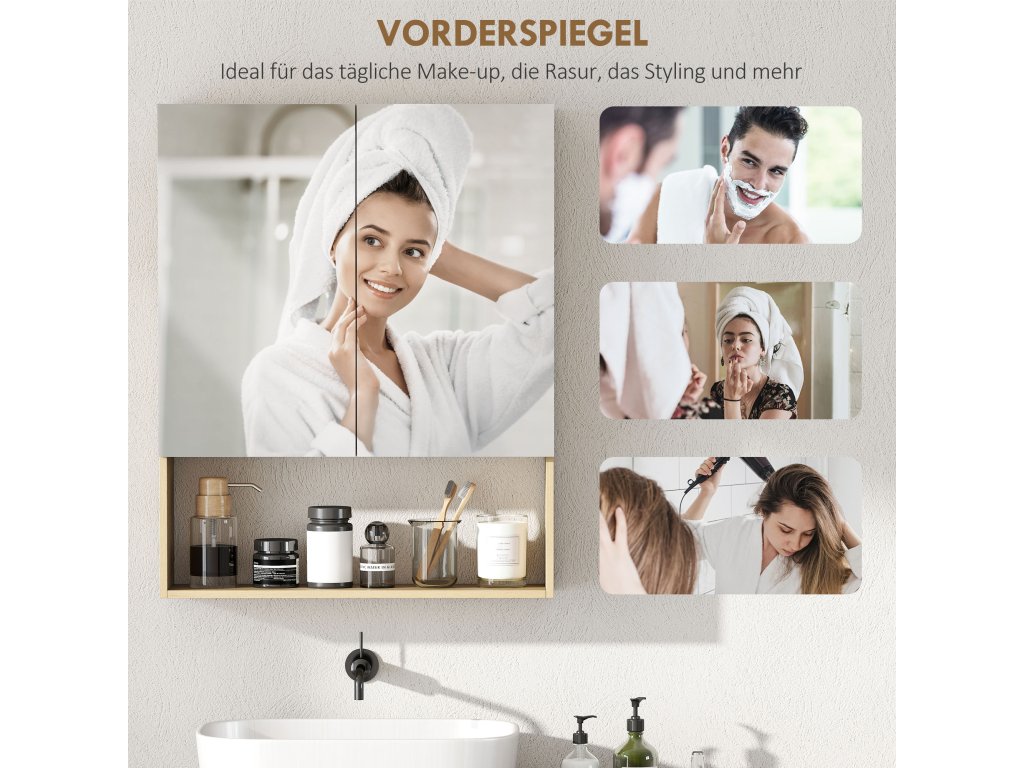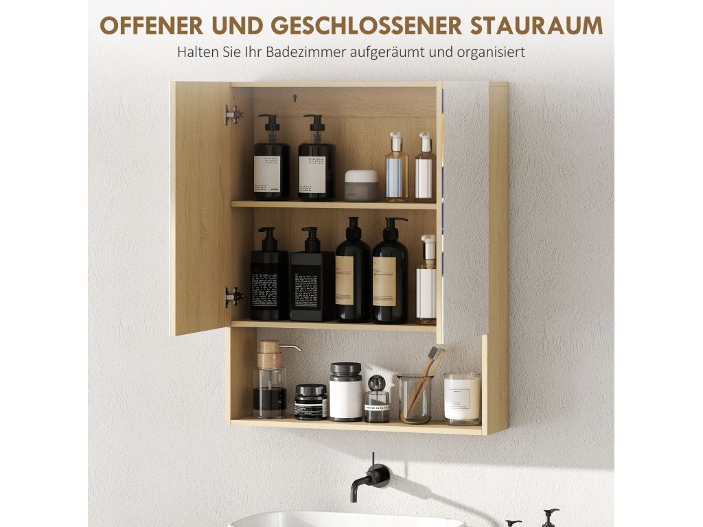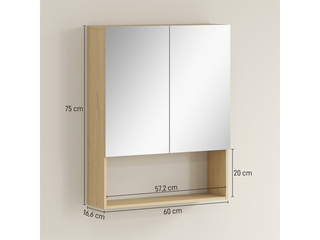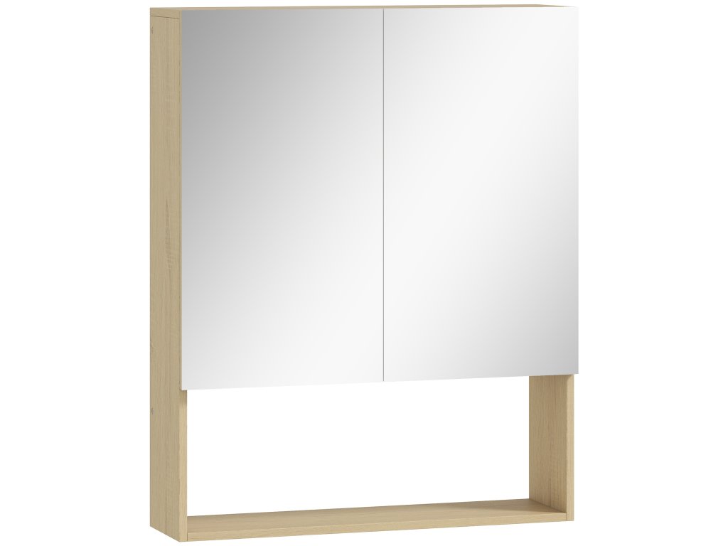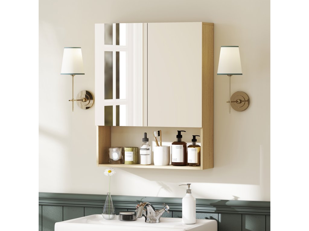 HOMCOM Koupelnová skříňka, zrcadlové dveře, otevřená police, nástěnná, MDF, dřevotříska, dub