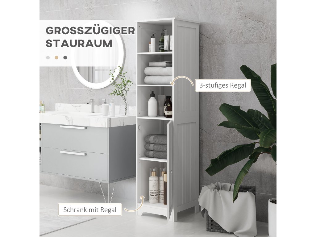 - Dostatek úložného prostoru: Vysoká skříňka se skládá ze dvou prvků a nabízí dostatek úložného prostoru díky skříňce s dvířky a třem otevřeným policím