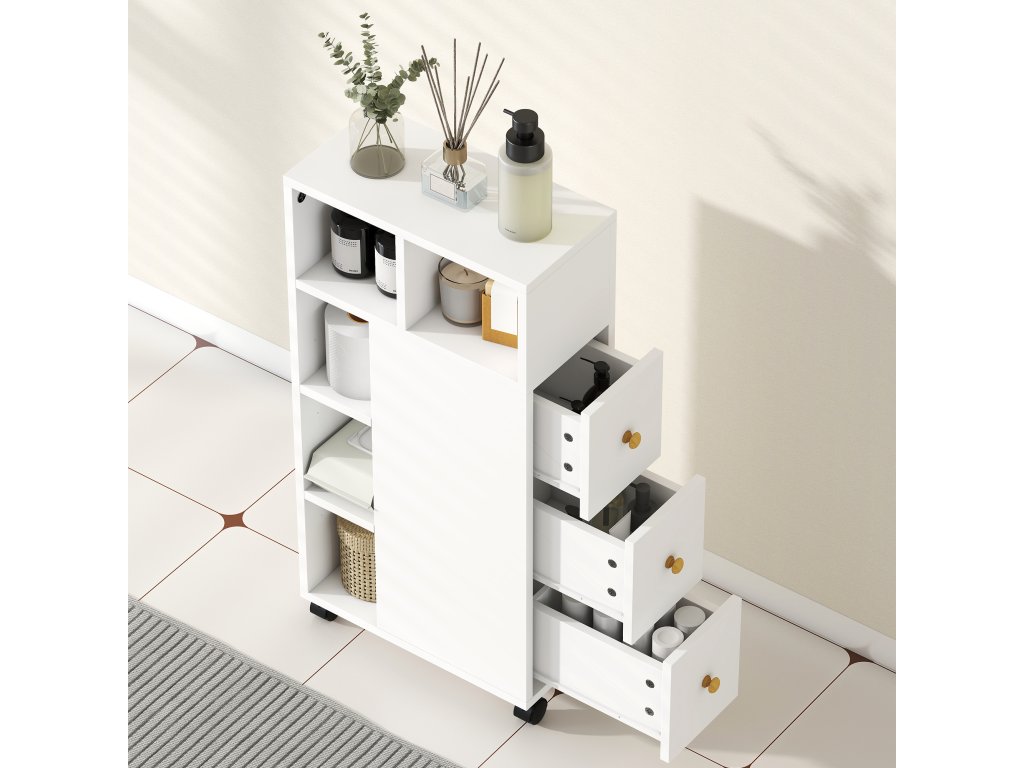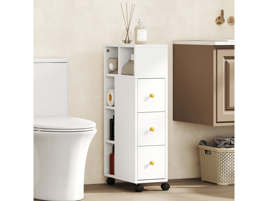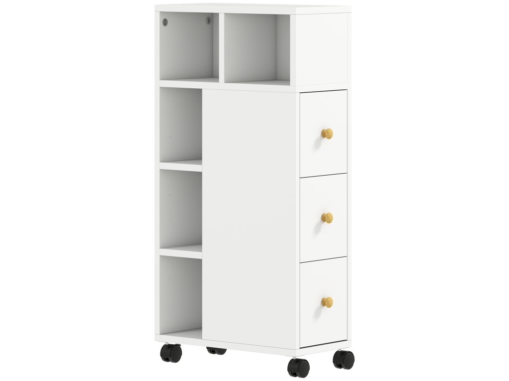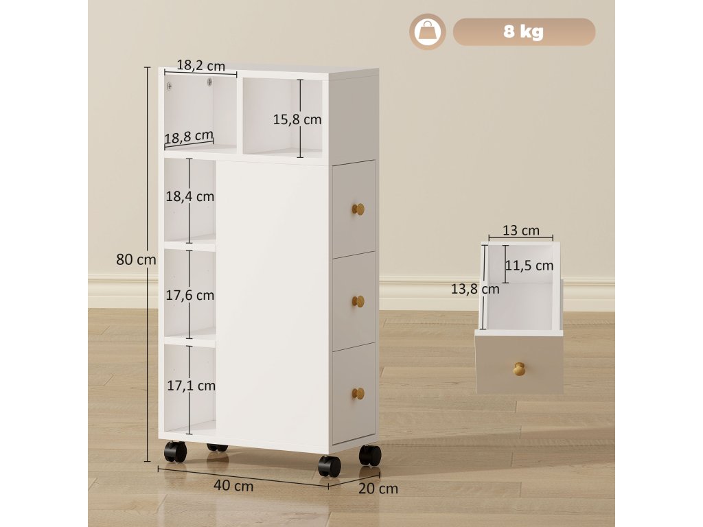 HOMCOM Koupelnová skříňka úzká, koupelnová skříňka se 4 kolečky, 3 zásuvky, 5 otevřených přihrádek, 20x40x80cm, bílá