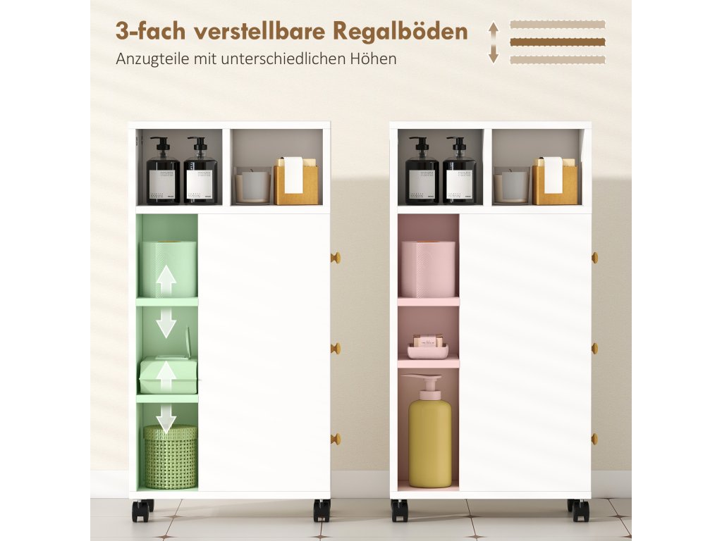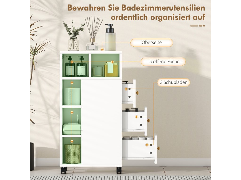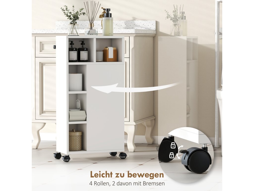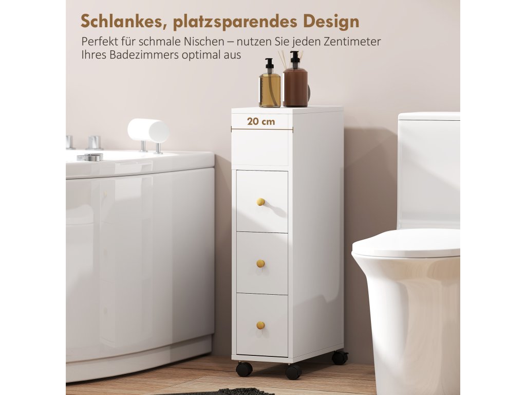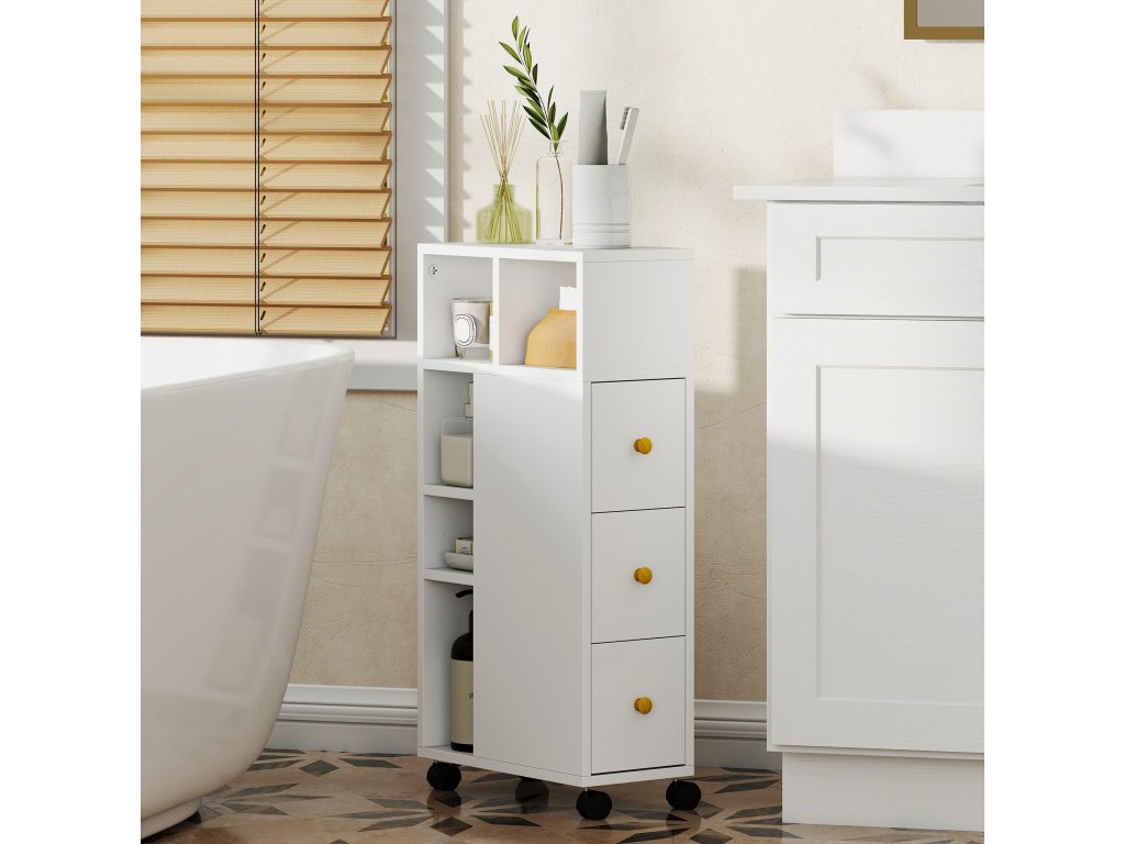 HOMCOM Koupelnová skříňka úzká, koupelnová skříňka se 4 kolečky, 3 zásuvky, 5 otevřených přihrádek, 20x40x80cm, bílá