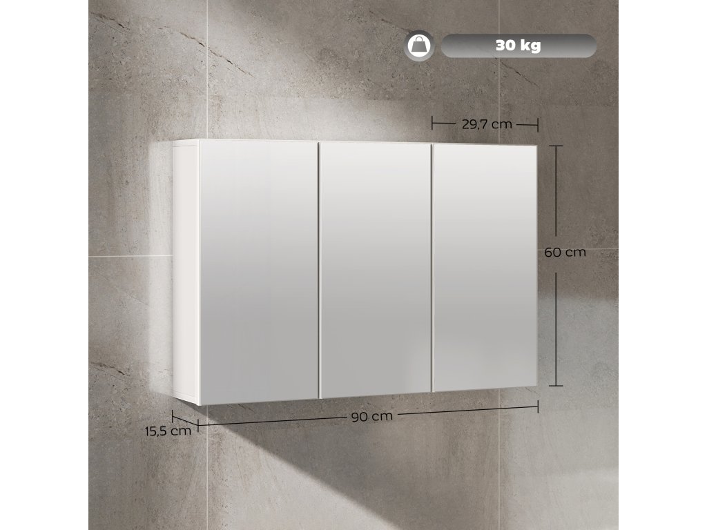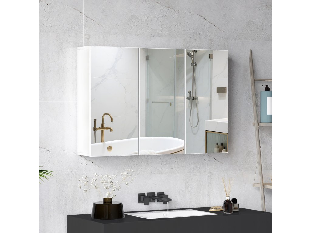 HOMCOM Koupelnová zrcadlová skříňka, koupelnová skříňka se 3 zrcadlovými dvířky, nástěnná, 90 x 15,5 x 60 cm, dřevotříska, bílá