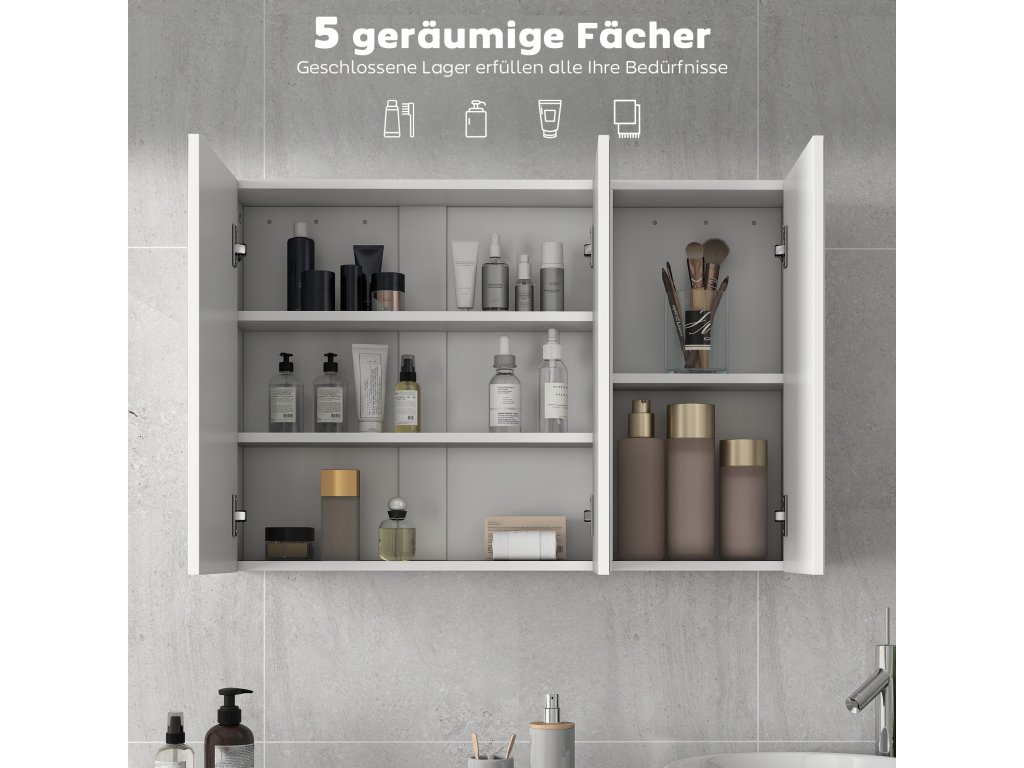 - ✔ Pět úložných polic v zrcadlové skříňce efektivně uspořádá toaletní potřeby, kosmetiku a léky