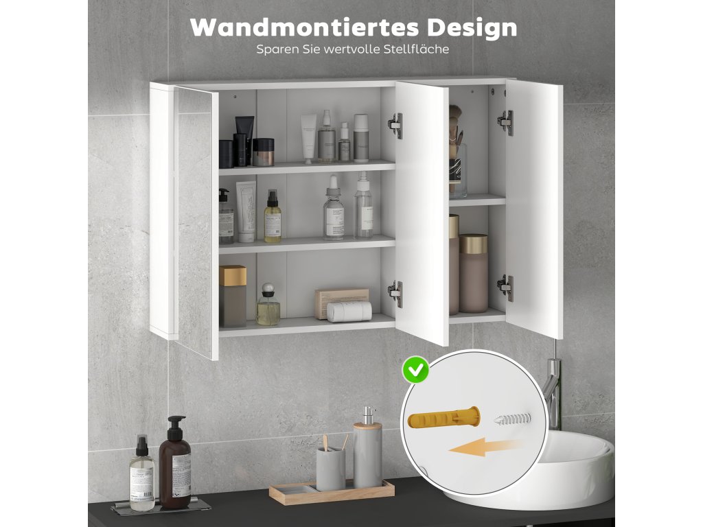 Koupelnová skříňka se zrcadlem HOMCOM vás každé ráno přivítá jasným, širokým odrazem svých tří dvířek a slibuje klidný začátek dne. Nástěnné provedení koupelnové skříňky se zrcadlem šetří místo na podlaze a usnadňuje úklid. Různé police uvnitř navíc poskytují přizpůsobitelné možnosti ukládání toaletních potřeb všech velikostí. Proměňte svou koupelnu v organizované a útulné útočiště díky úložné skříňce.