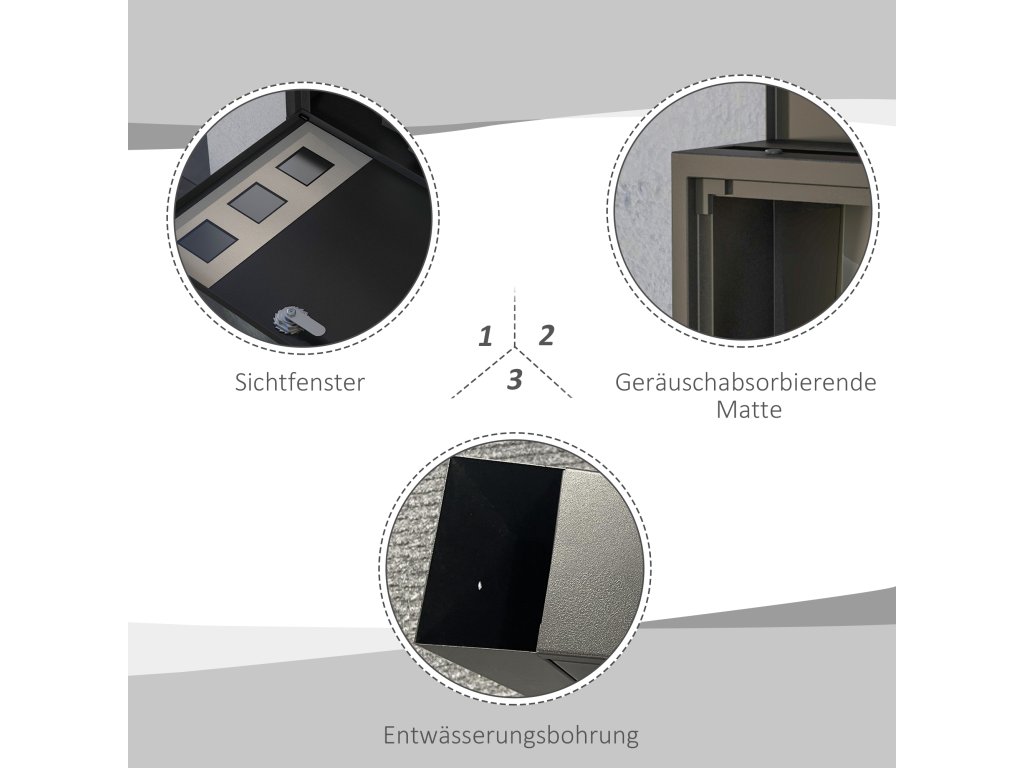 - Elegantní detaily: Moderní poštovní schránka má na krycí desce protihlukové podložky a na základně odtokové otvory. Součástí jsou také 3 průhledy, které usnadňují kontrolu pošty pouhým pohledem