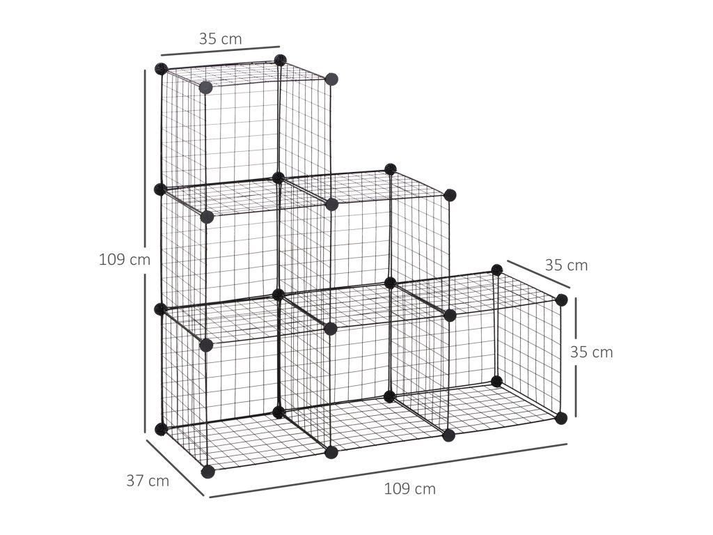 - Rozměry stupňovitého regálu: Jednotlivé kostky: 35 Š x 35 H x 35 V cm. Celkové rozměry: 109Š x 37D x 109V cm. Ideální pro použití doma nebo v kanceláři. Snadné čištění a údržba. Maximální nosnost: 30 kg. Nutná montáž