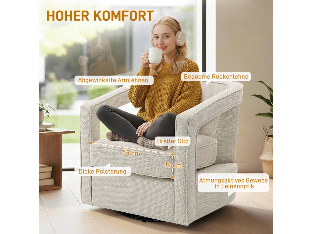Objevte pohodlí akcentového křesla HOMCOM s jednodílným opěradlem a područkami, které se dokonale přizpůsobí vašemu tělu, a širokým sedákem 55 cm pro uvolněné lenošení. Těšte se na 360° otočnou základnu, která vám umožní bez námahy se otočit jakýmkoli směrem, zatímco vzdušná látka připomínající len zajistí příjemný chládek. Čalouněné křeslo je stylovým doplňkem každé moderní domácnosti!